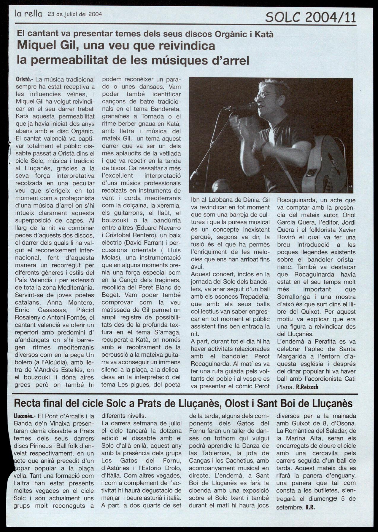 Oristà.- La música tradicional sempre ha estat receptiva a les influencies veïnes, Miquel Gil ha volgut reivindicar en el seu darrer treball Katà aquesta permeabilitat que ja havia iniciat dos anys abans amb el disc Orgànic. El cantat valencià va captivar totalment el públic dissabte passat a Oristà dins el cicle Solc, música tradició al Lluçanès, gràcies a la seva força interpretativa recalzada en una peculiar veu que s'erigeix en tot moment com a protagonista d'una música d'arrel on s'hi intueix clarament aquesta superposició de capes. AI llarg de la nit va combinar peces d'aquests dos discos, el darrer dels quals li ha valgut el reconeixement internacional, fent d'aquesta manera un recorregut per diferents gèneres estils del País Valencià i per extensió de tota la zona Mediterrània.