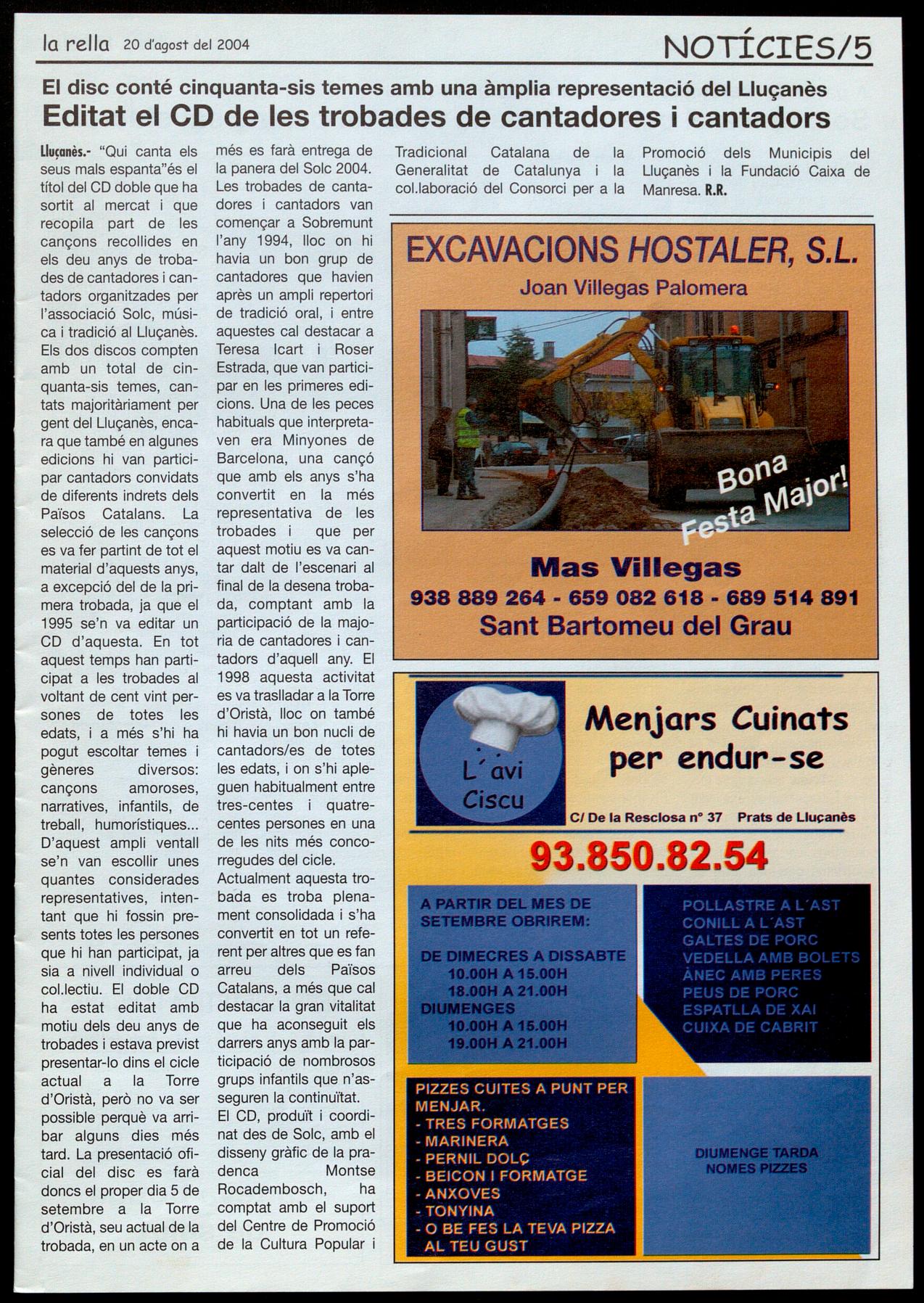 Llu�anès.- "Qui canta els seus mals espanta"és el títol del CD doble que ha sortit al mercat que recopila part de les cançons recollides en els deu anys de trobades de cantadores cantadors organitzades per l'associació Solc, música tradició al Lluçanès. Els dos discos compten amb un total de cinquanta-sis temes, cantats majoritàriament per gent del Lluçanès, encara que també en algunes edicions hi van participar cantadors convidats de diferents indrets dels Països Catalans. La selecció de les cançons es va fer partint de tot el material d'aquests anys, a excepció del de la primera trobada, ja que el 1995 se'n va editar un CD d'aquesta. En tot aquest temps han participat a les trobades al voltant de cent vint persones de totes les edats, a més s'hi ha pogut escoltar temes i gèneres diversos: cançons amoroses, narratives, infantils, de treball, humorístiques D'aquest ampli ventall se'n van escollir unes quantes considerades representatives, intentant que hi fossin presents totes les persones que hi han participat, ja sia a nivell individual a col.lectiu. El doble CD ha estat editat amb motiu dels deu anys de trobades i estava previst presentar-lo dins el cicle actual a la Torre d'Oristà, però no va ser possible perquè va arribar alguns dies més tard. La presentació oficial del disc es farà dones el proper dia 5 de setembre a la Torre d'Oristà, seu actual de la trobada, en un acte on a