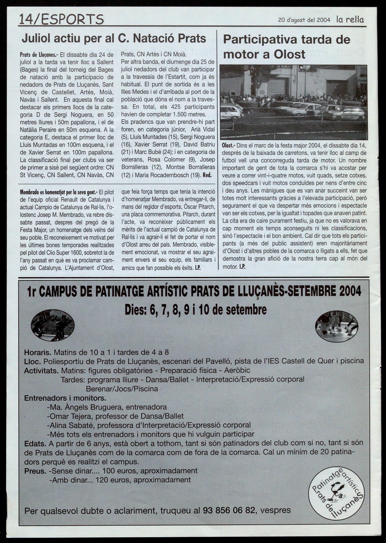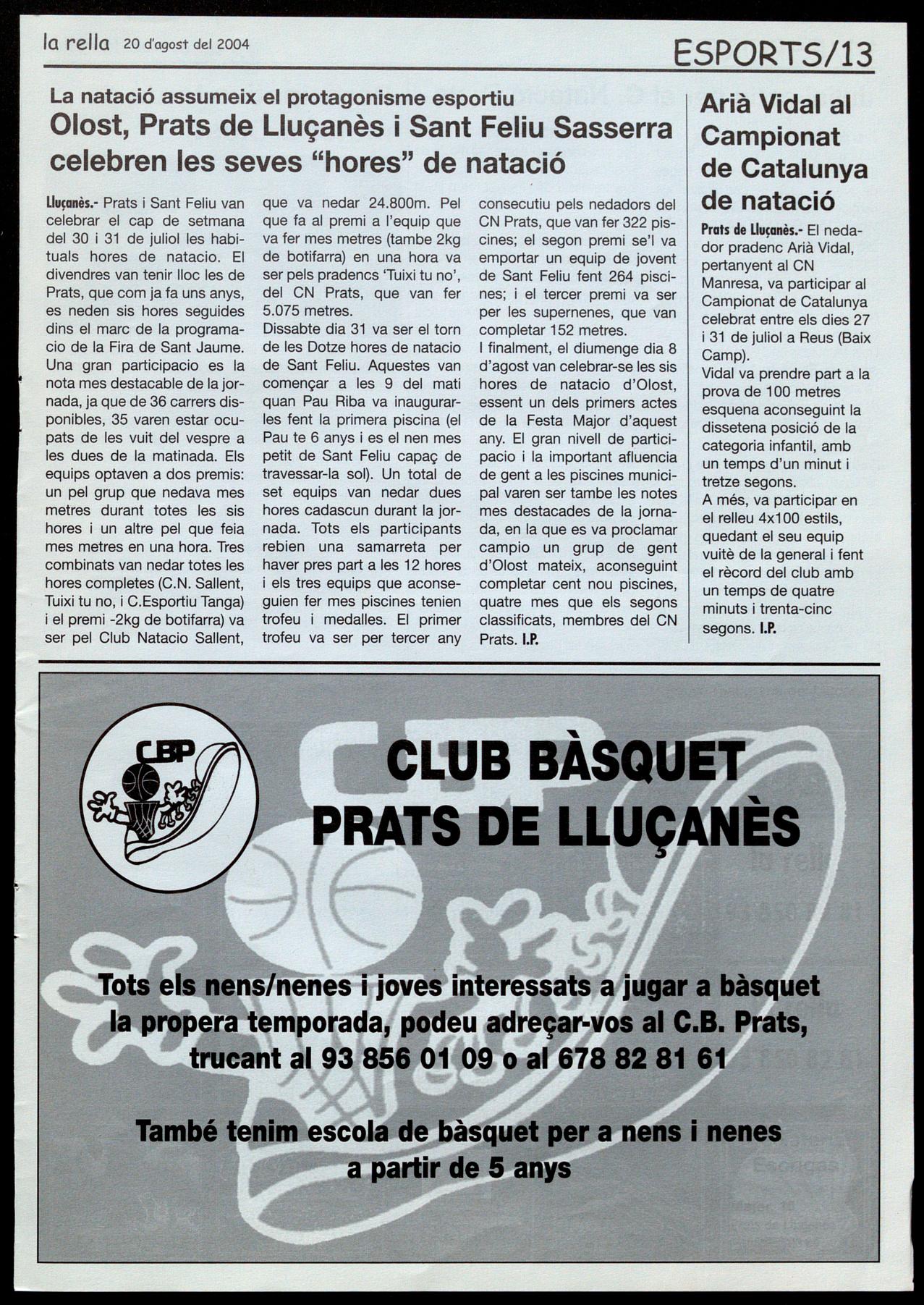 Prats de Llu�anes." El dissabte dia 24 de juliol a la tarda va tenir lloc a Sallent (Bages) la final del torneig del Bages de natació amb la participacio de nedadors de Prats de Lluçanès, Sant Vicenç de Castellet, Artés, Moià, Navàs i Sallent. En aquesta final cal destacar els primers llocs de la categoria D de Sergi Noguera, en 50 metres lliures i 50m papallona, el de Natàlia Peraire en 50m esquena. A la categoria E, destaca el primer lloc de Lluís Muntadas en 1 DOm esquena, el de Xavier Serrat en 1 DOm papallona. La classificació final per clubs va ser de primer a sisè pel següent ordre: CN St Vicenç, CN Sallent, CN Navàs, CN