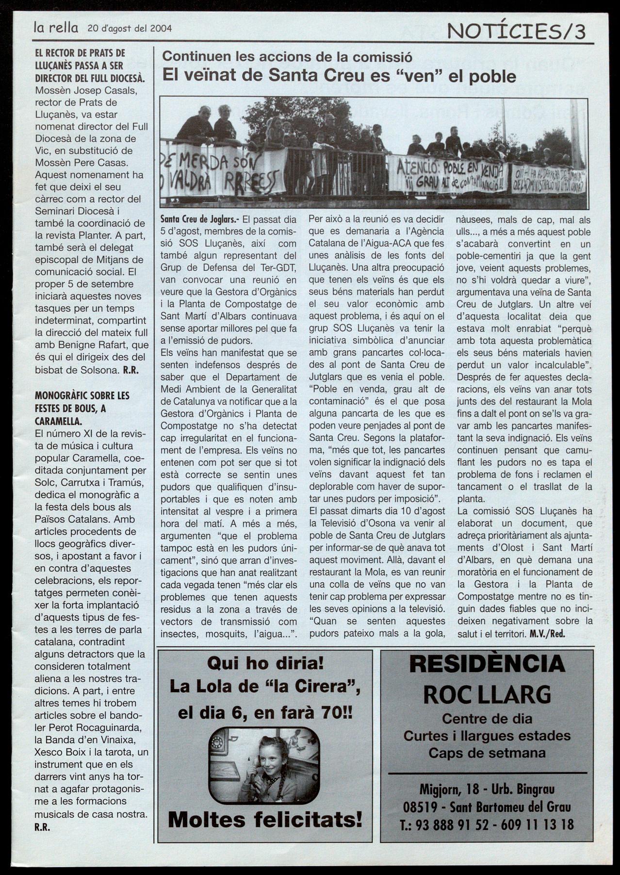 Per això a la reunió es va decidir que es demanaria a l'Agència Catalana de l'Aigua-ACA que fes unes anàlisis de les fonts del Lluçanès. Una altra preocupació que tenen els veïns és que els seus béns materials han perdut el seu valor econòmic amb aquest problema, és aquí on el grup SOS Lluçanès va tenir la iniciativa simbòlica d'anunciar amb grans pancartes col-locades al pont de Santa Creu de Jutglars que es venia el poble. "Poble en venda, grau alt de contaminació" és el que posa alguna pancarta de les que es poden veure penjades al pont de Santa Creu. Segons la plataforma, "més que tot, les pancartes volen significar la indignació dels veïns davant aquest fet tan deplorable com haver de suportar unes pudors per imposició". El passat dimarts dia 1 O d'agost la Televisió d'Osona va venir al poble de Santa Creu de Jutglars per informar-se de què anava tot aquest moviment. Allà, davant el restaurant la Mola, es van reunir una colla de veïns que no van tenir cap problema per expressar les seves opinions a la televisió. "Quan se senten aquestes pudors pateixo mals a la gola,