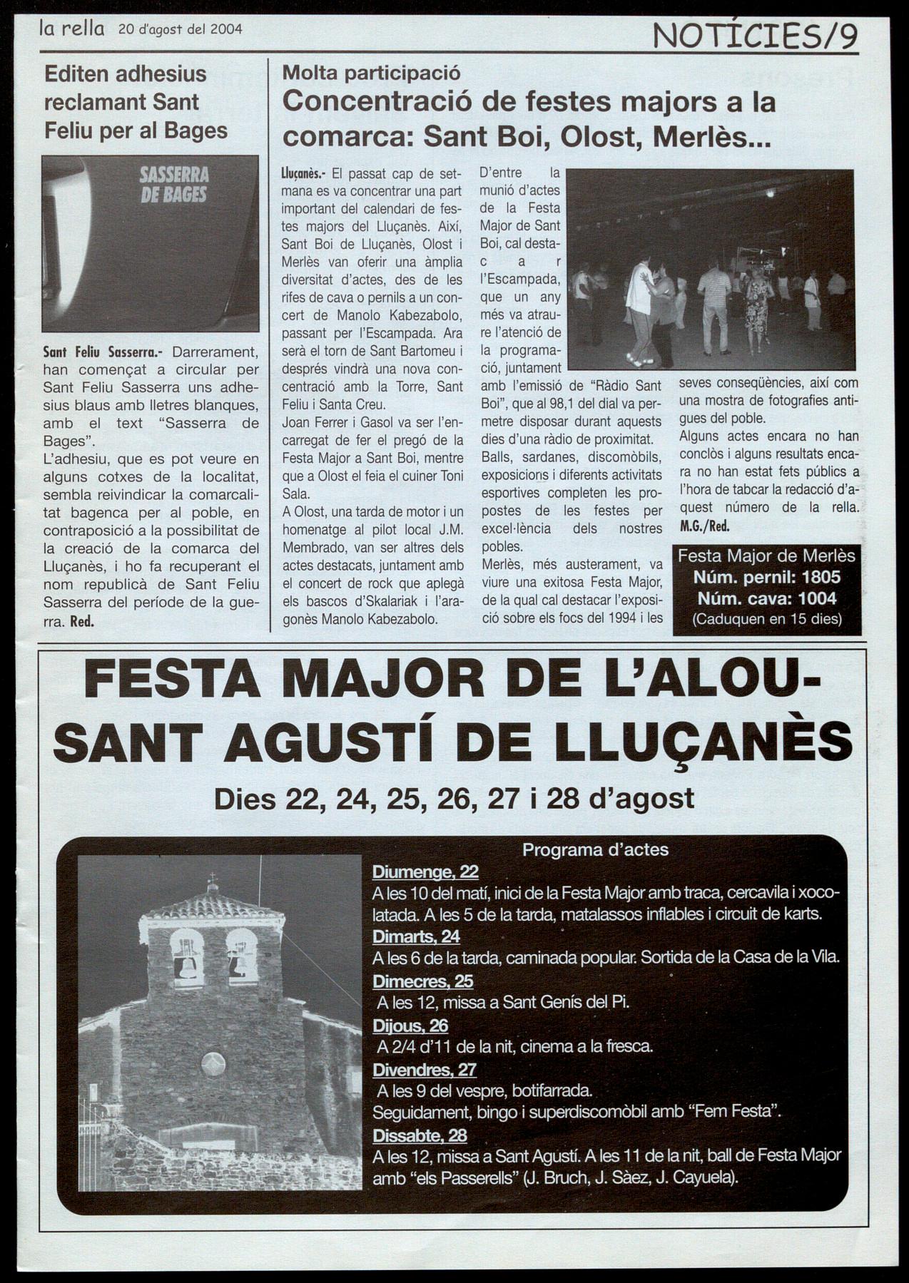 l:'AIou-Sant Agustí de Uuc:anès.- Festa Major. A les 9 del vespre, botifarrada. Seguidament, bingo superdiscomòbil amb "Fem Festa".