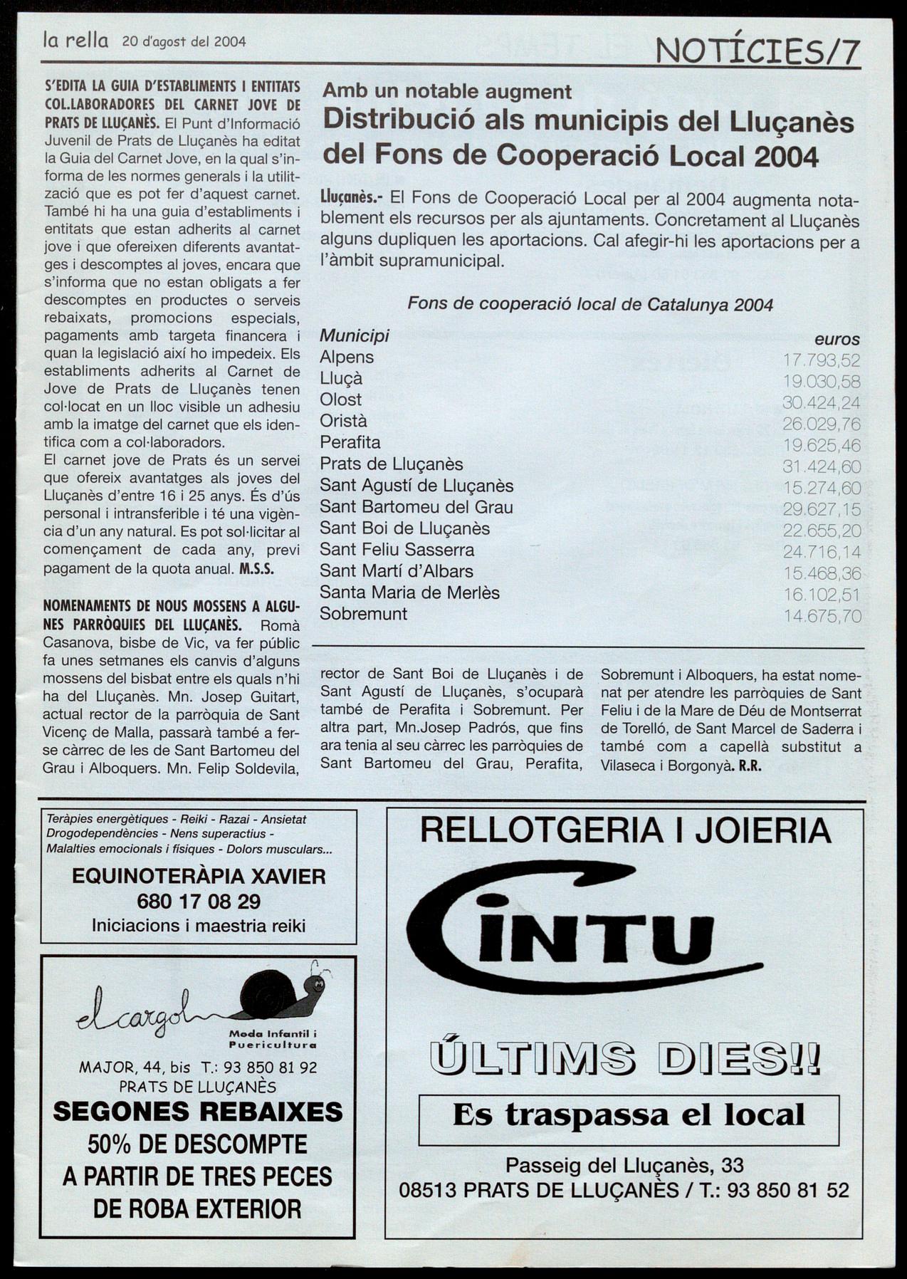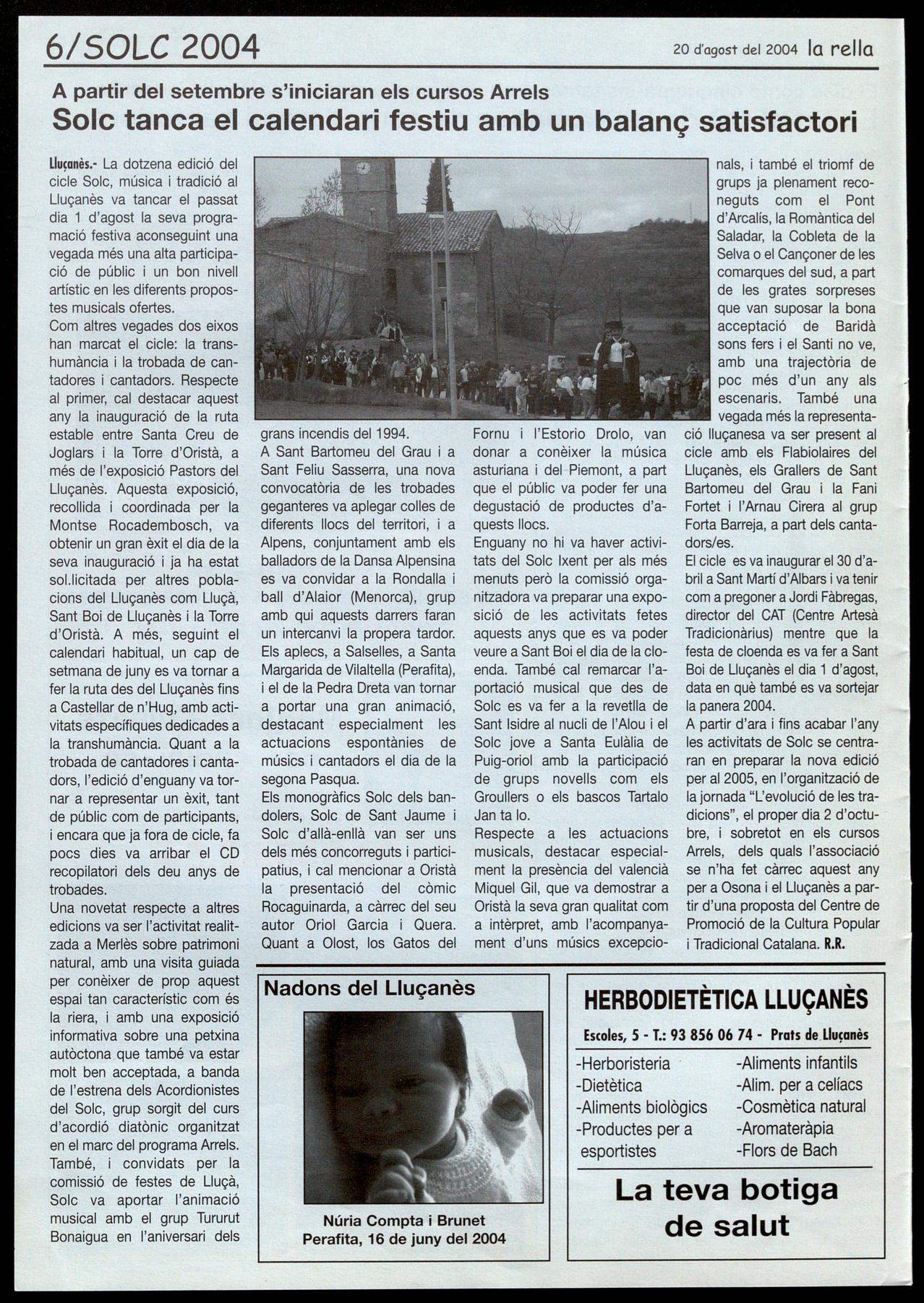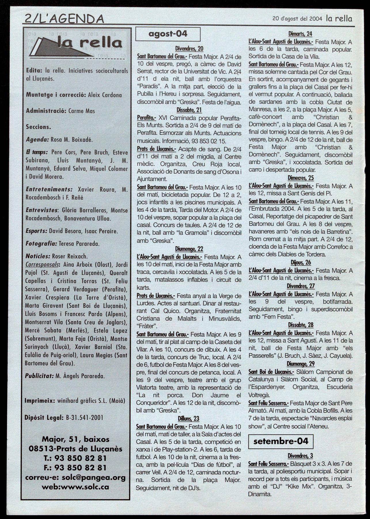 Corresponsals: Aina Arboix (Olost), Jordi Pujol (St. Agustí de lluçanès), Queralt Capellas i Cristina Torras (St. Feliu Sasserra), Gerard Verdaguer (Perafita), Xavier Crespiera (la Torre d'Oristà), Marta Giravent (Sant Boi de lluçanès), lluís Bosoms i Fruncesc Pardo (Alpens), Montserrat Vila (Santa Creu de Joglars), Mercè Sabata (Merlès), Estela lopez (Sobremunt), Marta Faja (Oristà), Montse Surinyach (lluçà), Xavier Barniol (Sta. Eulàlia de Puiq-oriol), laura Megias (Sant Bartomeu del Grau).