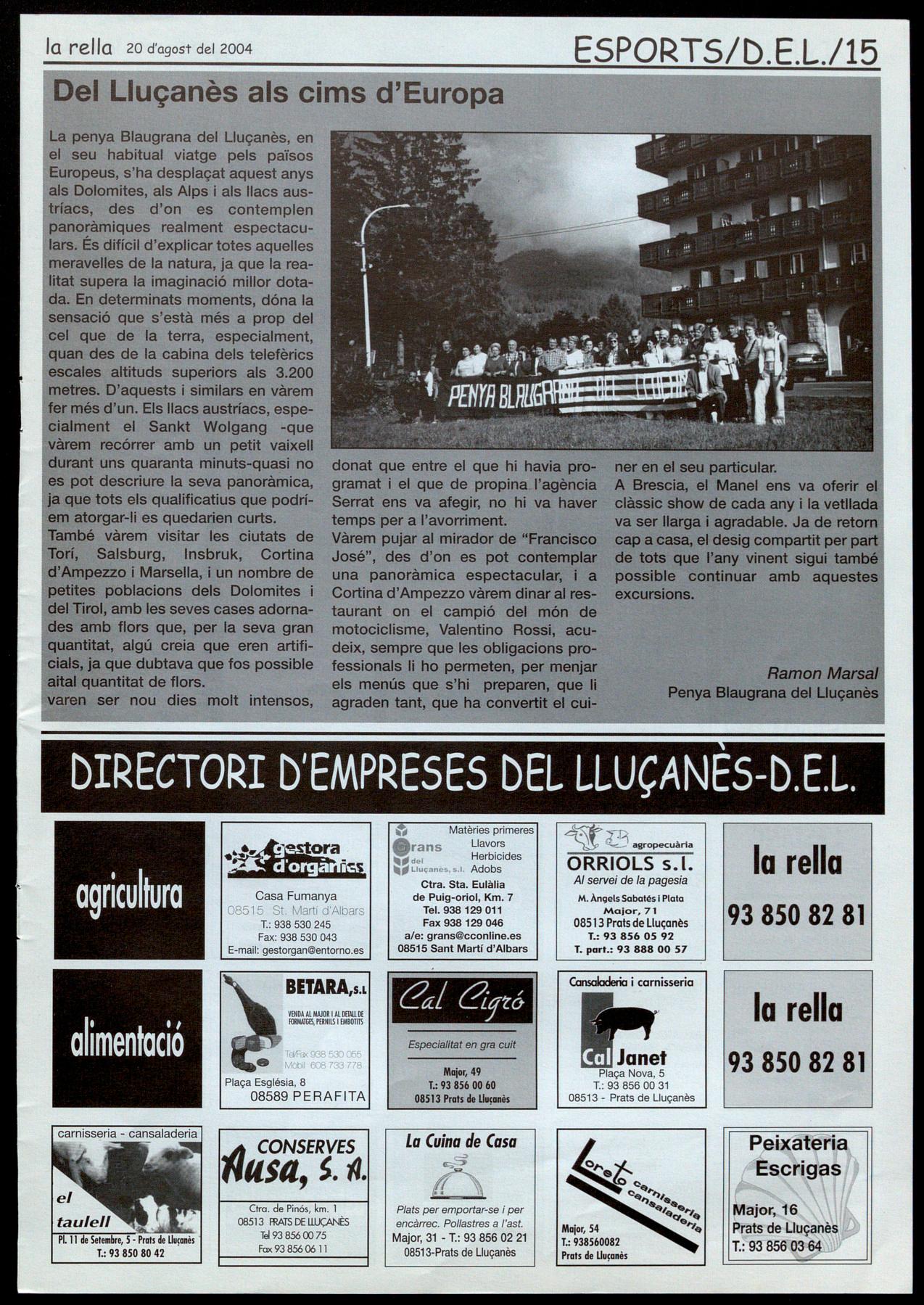 La penya Blaugrana del Lluçanès, en el seu habitual viatge pels països Europeus, s'ha desplaçat aquest anys als Dolomites, als Alps i als llacs austríacs, des d'on es contemplen panoràmiques realment espectaculars. És difícil d'explicar totes aquelles meravelles de la natura, ja que la realitat supera la imaginació millor dotada. En determinats moments, dóna la sensació que s'està més a prop del cel que de la terra, especialment, quan des de la cabina dels telefèrics escales altituds superiors als 3.200 metres. D'aquests i similars en vàrem fer més d'un. Els llacs austríacs, especialment el Sankt Wolgang -que vàrem recórrer amb un petit vaixell durant uns quaranta minuts-quasi no es pot descriure la seva panoràmica, ja que tots els qualificatius que podríem atorgar-li es quedarien curts.