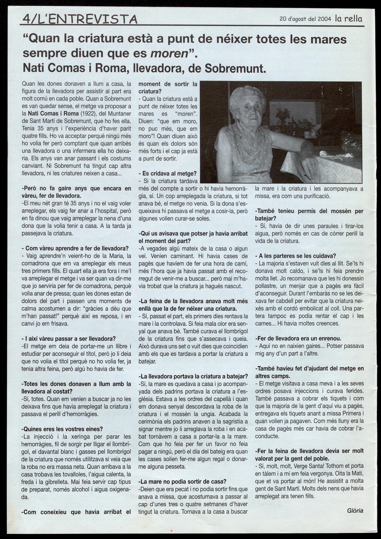 - Vaig aprendre'n veient-ho de la Maria, la comadrona que em va arreplegar els meus tres primers fills. El quart ella ja era fora i me'l va arreplegar el metge va ser quan va dir-me que jo serviria per fer de comadrona, perquè volia anar de pressa; quan les dones estan de dolors del part passen uns moments de calma acostumen a dir: "gràcies a déu que m'han passat!" perquè així es reposa, i en canvi jo em frisava.
