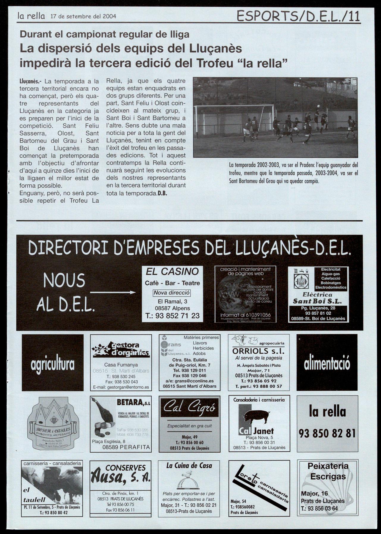 Rella, ja que els quatre equips estan enquadrats en dos grups diferents. Per una part, Sant Feliu Olost coincideixen al mateix grup, i Sant Boi Sant Bartomeu a l'altre. Sens dubte una mala noticia per a tata la gent del Lluçanès, tenint en compte l'èxit del trofeu en les passades edicions. Tot aquest contratemps la Rella continuarà seguint les evolucions dels nostres representants en la tercera territorial durant tata la temporada.D.B.