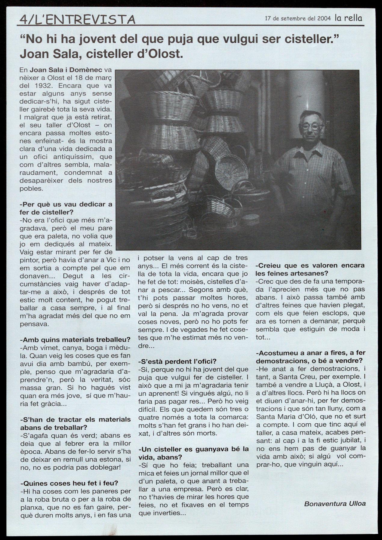 En Joan Sala i Domènec va nèixer a Olost el 18 de març del 1932. Encara que va estar alguns anys sense dedicar-s'hi, ha sigut cisteller gairebé tota la seva vida. I malgrat que ja està retirat, el seu taller d'Olost - on encara passa moltes estones enfeinat- és la mostra clara d'una vida dedicada a un ofici antiquíssim, que com d'altres sembla, malaraudament, condemnat a desaparèixer dels nostres pobles.