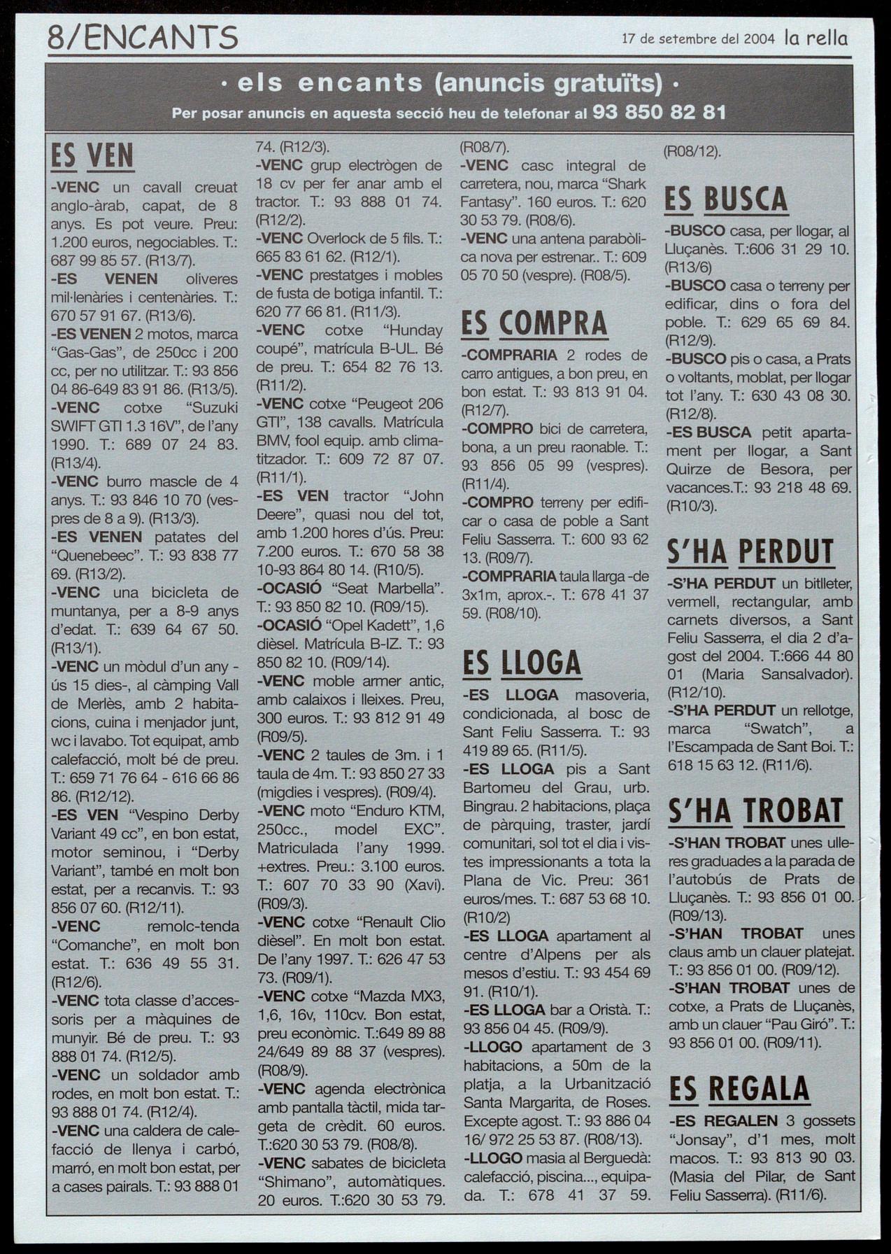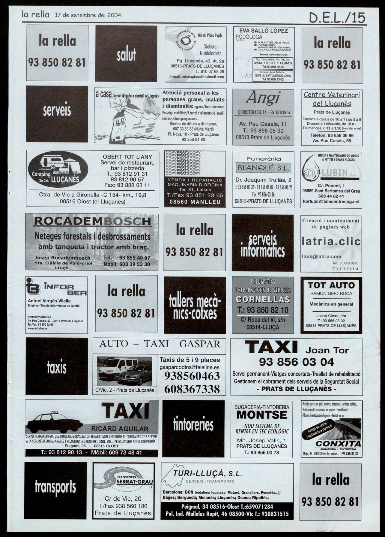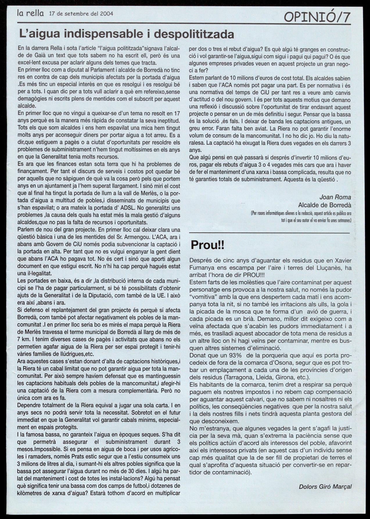 Corresponsals: Aina Arboix (Olost), Jordi Pujol (Sant Agustí de lluçanès), Carme Boixoder (Sant Feliu Sasserra), Gerard Verdaguer (Perafita), Xavier Crespiero (lo Torre d'Oristà), Morta Girovent (Sant Boi de lluçanès), lluís Bosoms i Froncesc Pardo (Alpens), Montserrat Vilo (Santo Creu de Joglars), Mercè Sabata (Merlès), Estelo Lopez (Sobremunt), Morta Foío (Oristà), Montse Surinyoch (lluçà), Xavier Borniol (Sta. Eulàlia de Puiq-oriol), Laura Megios (Sont Bartomeu del Grou).