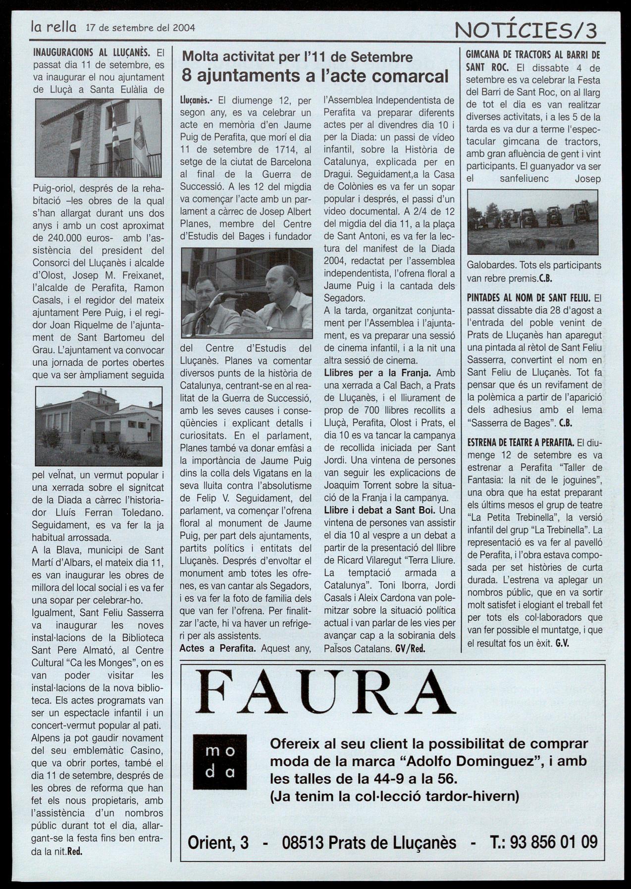 Lluçanès.- El diumenge 12, per segon any, es va celebrar un acte en memòria d'en Jaume Puig de Perafita, que morí el dia 11 de setembre de 1714, al setge de la ciutat de Barcelona al final de la Guerra de Successió. A les 12 del migdia va començar l'acte amb un parlament a càrrec de Josep Albert Planes, membre del Centre d'Estudis del Bages fundador