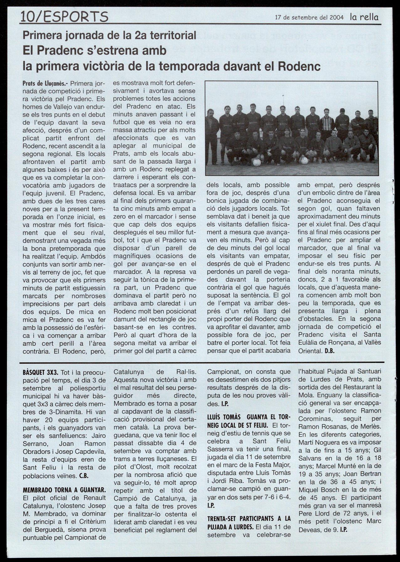 amb empat, però després d'un embolic dintre de l'àrea el Pradenc aconseguia el segon gol, quan faltaven aproximadament deu minuts per el xiulet final. Des d'aquí fins al final més ocasions per el Pradenc per ampliar el marcador, que al final va imposar el seu físic per endur-se els tres punts. AI final dels noranta minuts, doncs, 2 a 1 favorable als locals, que d'aquesta manera comencen amb molt bon peu la temporada, que es presenta llarga plena d'obstacles. En la segona jornada de competició el Pradenc visita el Santa Eulàlia de Ronçana, al Vallès Oriental. D.B.