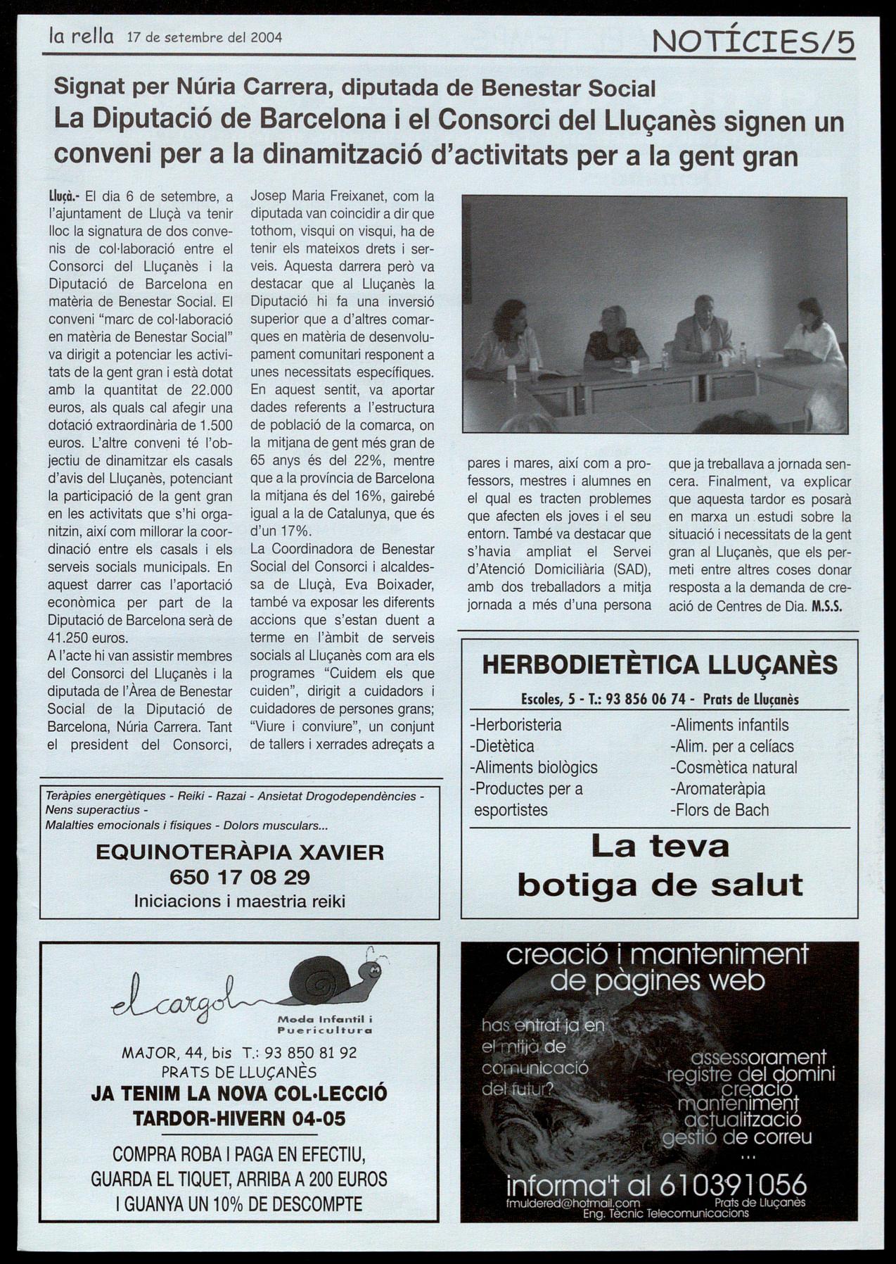 Llu�à.· El dia 6 de setembre, a l'ajuntament de Lluçà va tenir lloc la signatura de dos convenis de col-laboració entre el Consorci del Lluçanès la Diputació de Barcelona en matèria de Benestar Social. El conveni "marc de col·laboració en matèria de Benestar Social" va dirigit a potenciar les activitats de la gent gran i està dotat amb la quantitat de 22.000 euros, als quals cal afegir una dofació extraordinària de 1.500 euros. L'altre conveni té l'objectiu de dinamitzar els casals d'avis del Lluçanès, potenciant la participació de la gent gran en les activitats que s'hi organitzin, així com millorar la coordinació entre els casals els serveis socials municipals. En aquest darrer cas l'aportació econòmica per part de la Diputació de Barcelona serà de 41.250 euros.