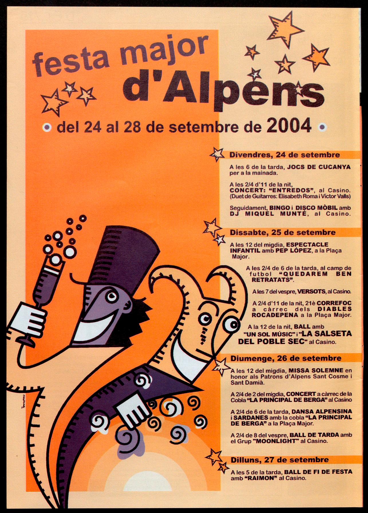 Alpens.- Festa Major. A les 12 del migdia, espectacle infantil amb Pep Lopez, a la plaça Majar. A 2/4 de 6 de la tarda, al camp de futbol, "Quedarem ben retratats". A les 7 del vespre, Versats, al Casino.A2/4 d't 1 de la nit, 21è Correfoc a càrrec dels Diables Rocadepena, a la plaça Major. A les 12 de la nit, ball amb "Un sol músic" "la Salseta del Poble Sec", al Casino.
