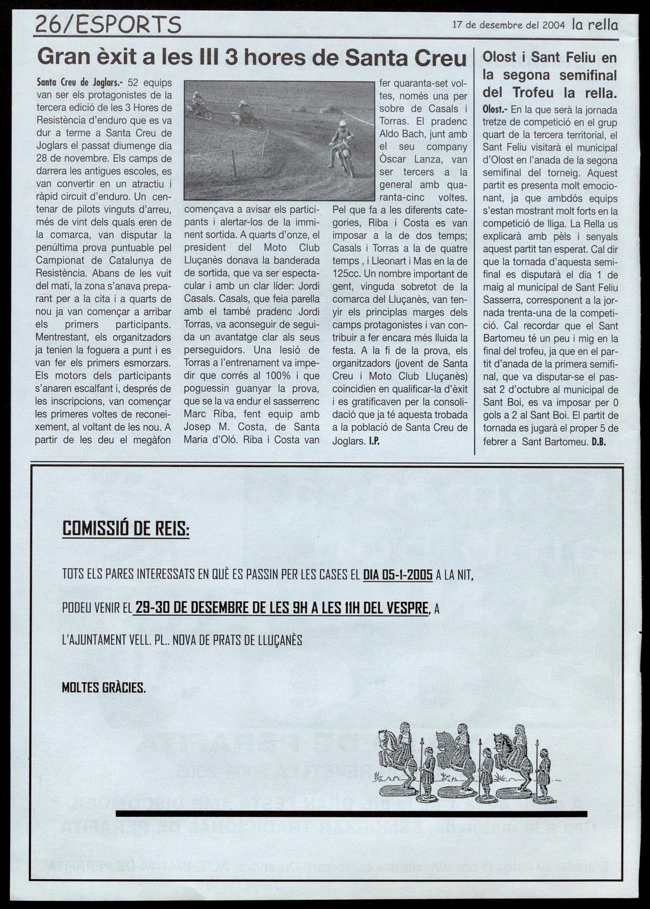 Santa (reu de Joglars." 52 equips van ser els protagonistes de la tercera edició de les 3 Hores de Resistència d'enduro que es va dur a terme a Santa Creu de Joglars el passat diumenge dia 28 de novembre. Els camps de darrera les antigues escoles, es van convertir en un atractiu ràpid circuit d'enduro. Un centenar de pilots vinguts d'arreu, més de vint dels quals eren de la comarca, van disputar la penúltima prova puntuable pel Campionat de Catalunya de Resistència. Abans de les vuit del matí, la zona s'anava preparànLRer a la cita a quarts de nou ja van començar a arribar els primers participants. Mentrestant, els organitzadors ja tenien la foguera a punt es van fer els primers esmorzars. Els motors dels participants s'anaren escalfant i, després de les inscripcions, van començar les primeres voltes de reconeixement, al voltant de les nou. A partir de les deu el megàfon