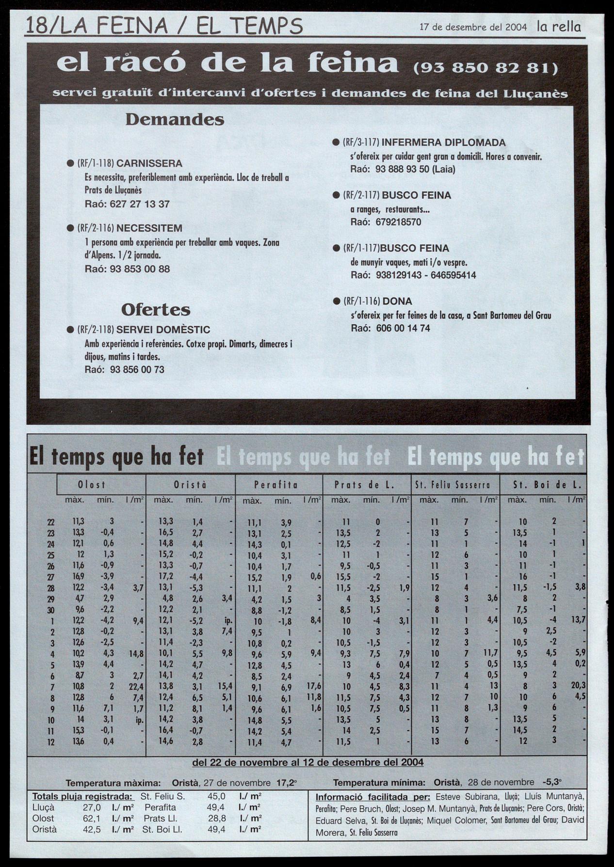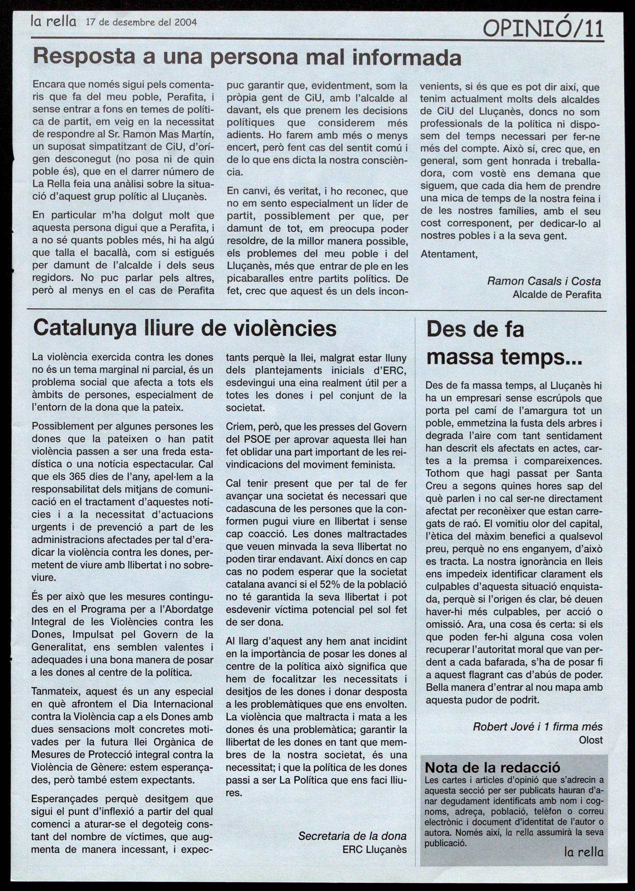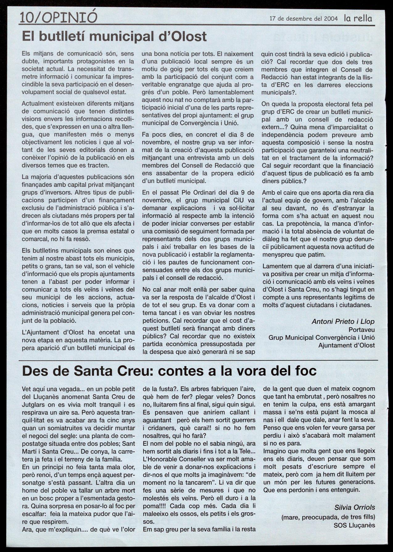 Corresponsals: Aina Arboix (Olost), Jordi Pujol (Sant Agustí de lluçanès), Carme Boixoder (Sant Feliu Sasserra), Gerard Verdaguer (Perafita), Xavier Crespiera (Lo Torre d'Oristà), Morta Giravent (Sant Boi de Lluçanès), Lluís Bosoms i Francesc Pardo (Alpens), Montserrat Vilo (Santo Creu de Joglars), Mercè Sabata (Merlès), Estela Lopez (Sobremunt), Morta Faja (Oristà), Montse Surinyach (Lluçà), Xavier Borniol (Sta Eulàlia de Puiq-oriol), Laura Megias (Sant Bartomeu del Grou).