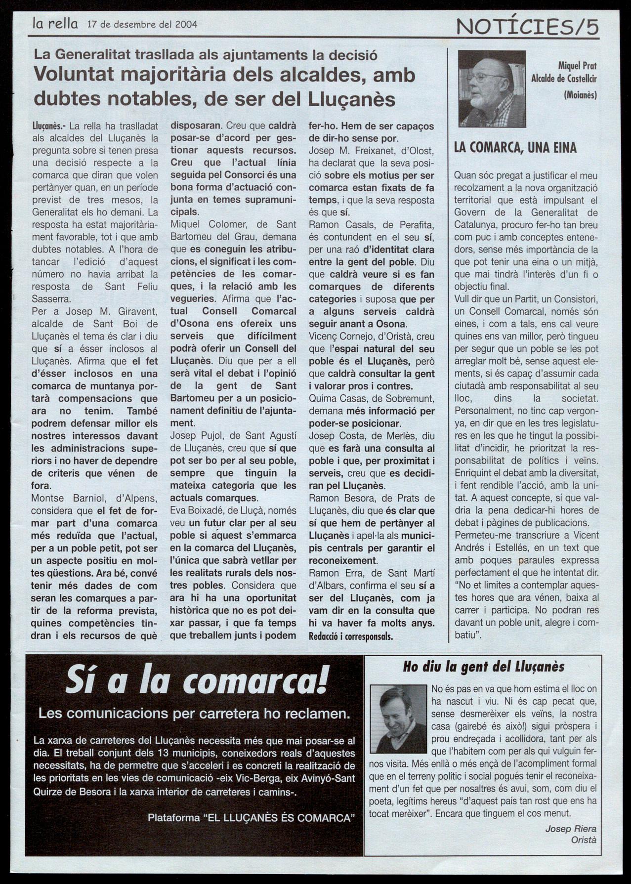 L1uçanès.- La rella ha traslladat als alcaldes del Lluçanès la pregunta sobre si tenen presa una decisió respecte a la comarca que diran que volen pertànyer quan, en un període previst de tres mesos, la Generalitat els ho demani. La resposta ha estat majoritàriament favorable, tot que amb dubtes notables. A l'hora de tancar l'edició d'aquest número no havia arribat la resposta de Sant Feliu Sasserra.