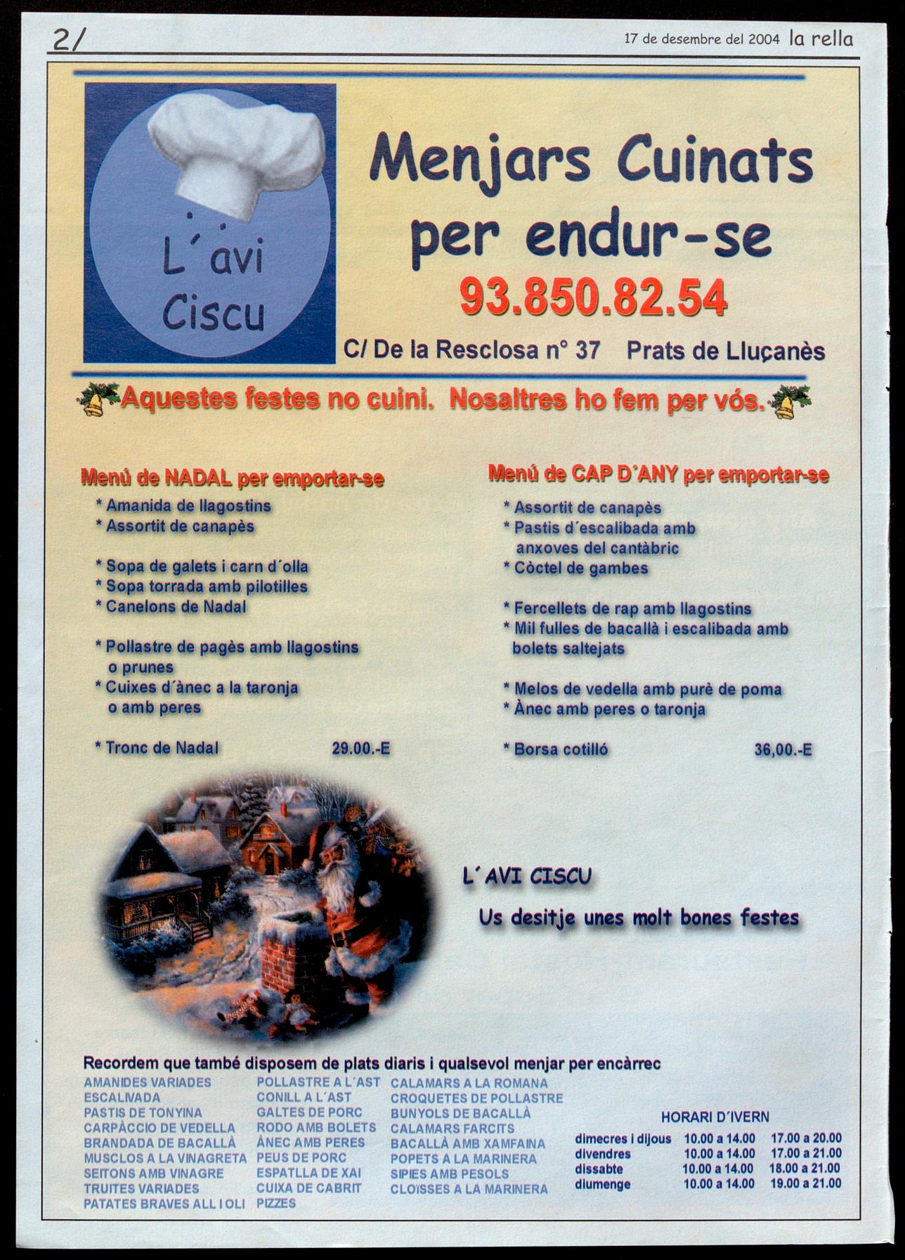 OBERT TOT L'ANY Servei de restaurant, bar pizzeria T.: 9381291 31 938129057