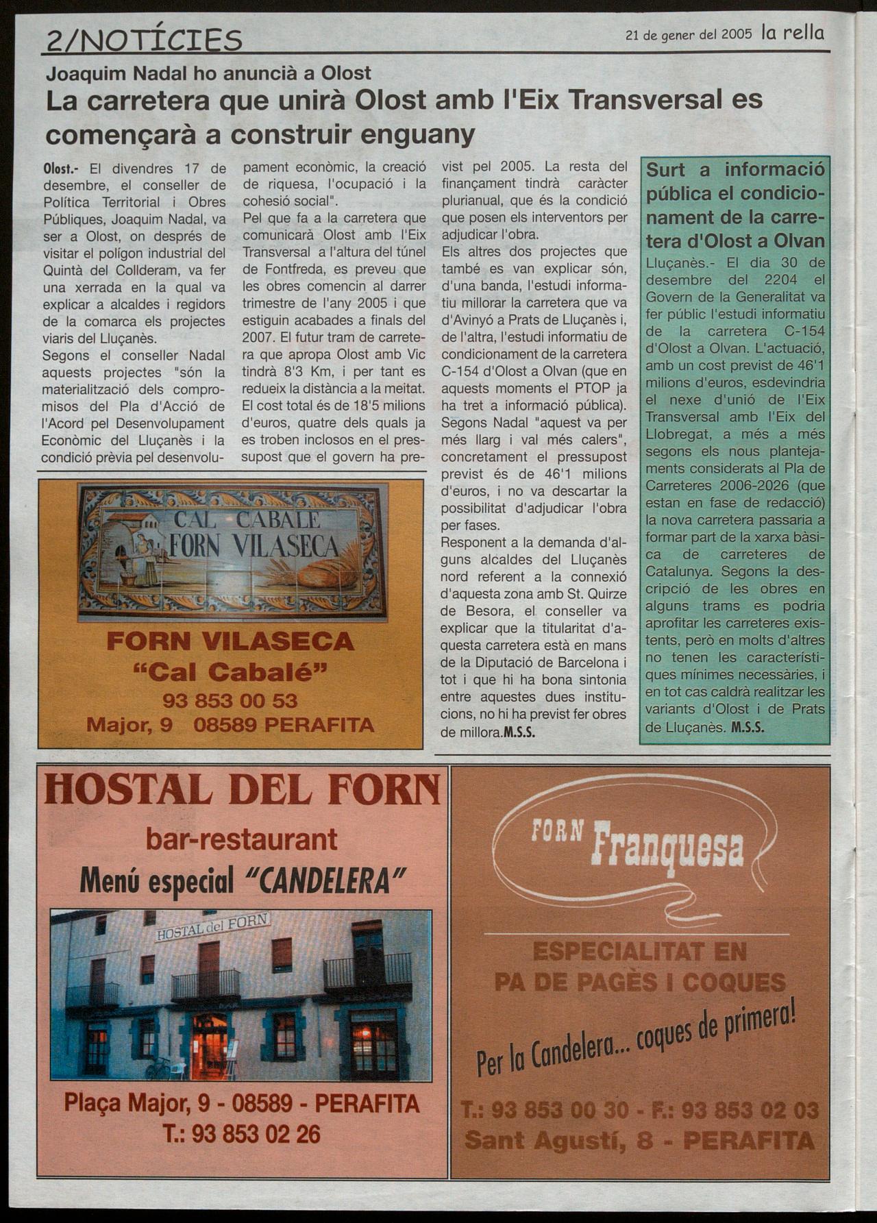 Surt a informació pública el condicionament de la carretera d'Olost a Olvan Lluçanès> El dia 30 de desembre del 2204 el Govern de la Generalitat va fer públic l'estudi informatiu de la carretera C-154 d'Olost a Olvan. L'actuació, amb un cost previst de 46'1 milions d'euros, esdevindria el nexe d'unió de l'Eix Transversal amb l'Eix del Llobregat, a més a més segons els nous plantejaments considérats al Pla de Carreteres 2006-2026 (que estan en fase de redacció) la nova carretera passaria a formar part de la xarxa bàsica de carreteres de Catalunya. Segons la descripció Gle les obres en alguns trams es poaria aprofitar les carreteres existents, però en molts d'altres no tenen les característiques mínimes necessàries, en tot cas caldrà realit�ar les variants d'Olost de Prats de Llu<¡:anès. M.S.S.