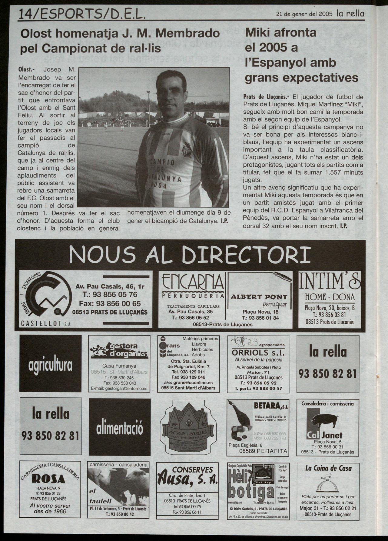 Prals de Lluçanès.- El jugador de futbol de Prats de Lluçanès, Miquel Martínez "Miki", segueix amb molt bon camí la temporada amb el segon equip de l'Espanyol. Si bé el principi d'aquesta campanya no va ser bona per als interessos blanc-iblaus, l'equip ha experimentat un ascens important a la taula classificatòria.