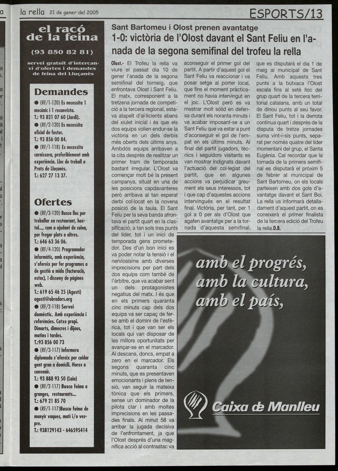 que es disputarà el dia 1 de maig al municipal de Sant Feliu. Amb aquests tres punts a la butxaca l'Olost escala fins al setè lloc del grup quart de la tercera territorial catalana, amb un total de dinou punts al seu favor. El Sant Feliu, tot i la derrota continua quart i després de la disputa de tretze jornades suma vint-i-sis punts, separat per només quatre dellíder momentani del grup, el Santa Eugènia. Cal recordar que la tornada de la primera semifinal es disputarà el pròxim 5 de febrer al municipal de Sant Bartomeu, on els locals parteixen amb dos gols d'avantatge davant el Sant Boi. La rella us informarà detalladament d'aquest partit, on es coneixerà el primer finalista de la tercera edició del Trofeu la rella.D.B.