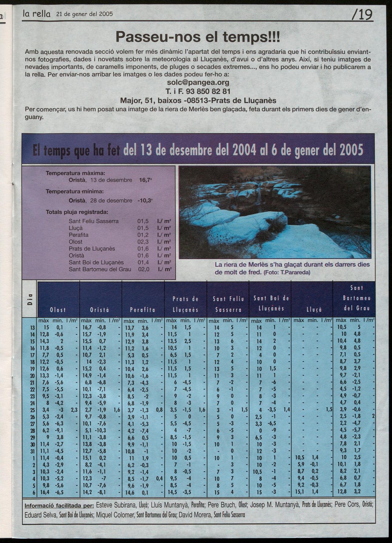 Amb aquesta renovada secció volem fer més dinàmic l'apartat del temps ens agradaria que hi contribuïssiu enviantnos fotografies, dades i novetats sobre la meteorologia al Lluçanès, d'avui a d'altres anys. Així, si teniu imatges de nevades importants, de caramells imponents, de pluges a secades extremes ens ho podeu enviar ho publicarem a la rella. Per enviar-nos arribar les imatges a les dades podeu fer-ho a: solc@pangea.org