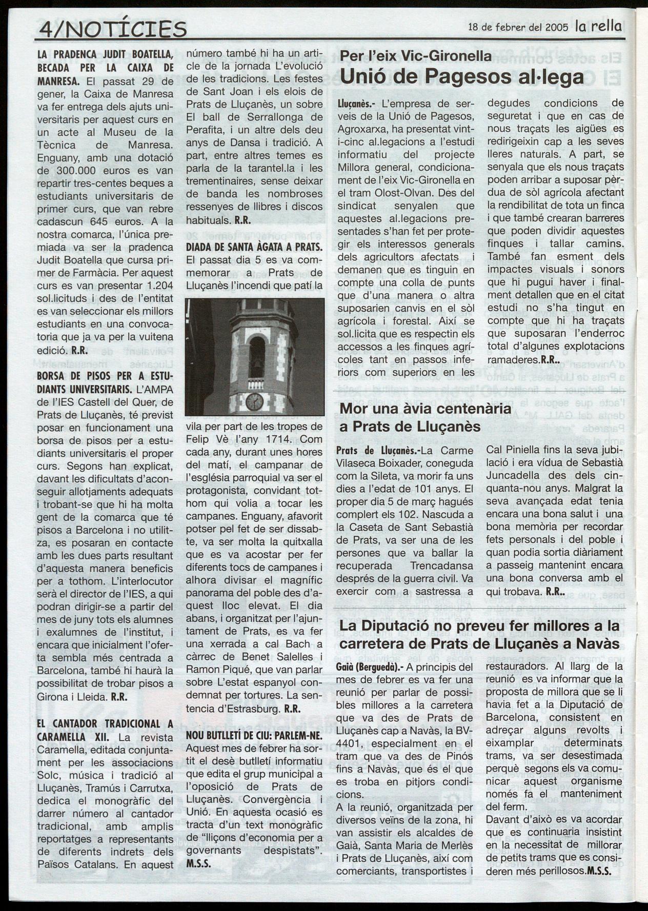 vila per part de les trapes de Felip Vè l'any 1714. Com cada any, durant unes hores del matí, el campanar de l'església parroquial va ser el protagonista, convidant tothom qui volia a tocar les campanes. Enguany, afavorit potser pel fet de ser dissabte, va ser molta la quitxalla que es va acostar per fer diferents tocs de campanes i alhora divisar el magnífic panorama del poble des d'aqúest lloc elevat. El dia abans, i organitzat per l'ajuntament de Prats, es va fer una xerrada a cal Bach a càrrec de Benet Salelles i Ramon Piqué, que van parlar sobre L'estat espanyol condemnat per tortures. La sentencia d'Estrasburg. R.R.