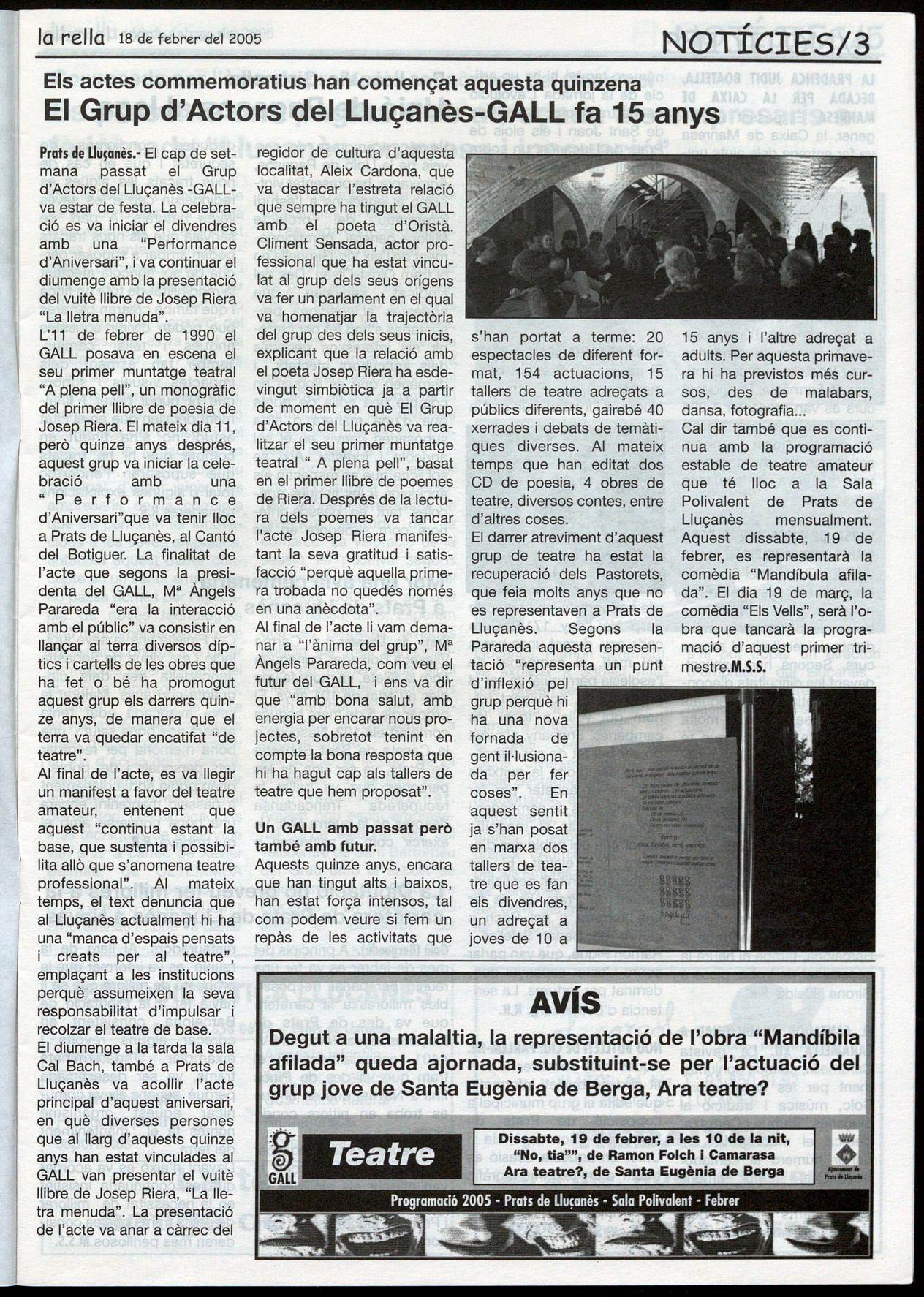 Prats de Llu�anès.· El cap de setmana passat el Grup d'Actors del Lluçanès -GALLva estar de festa. La celebració es va iniciar el divendres amb una "Performance d'Aniversari", i va continuar el diumenge amb la presentació del vuitè llibre de Josep Riera "La lletra menuda".