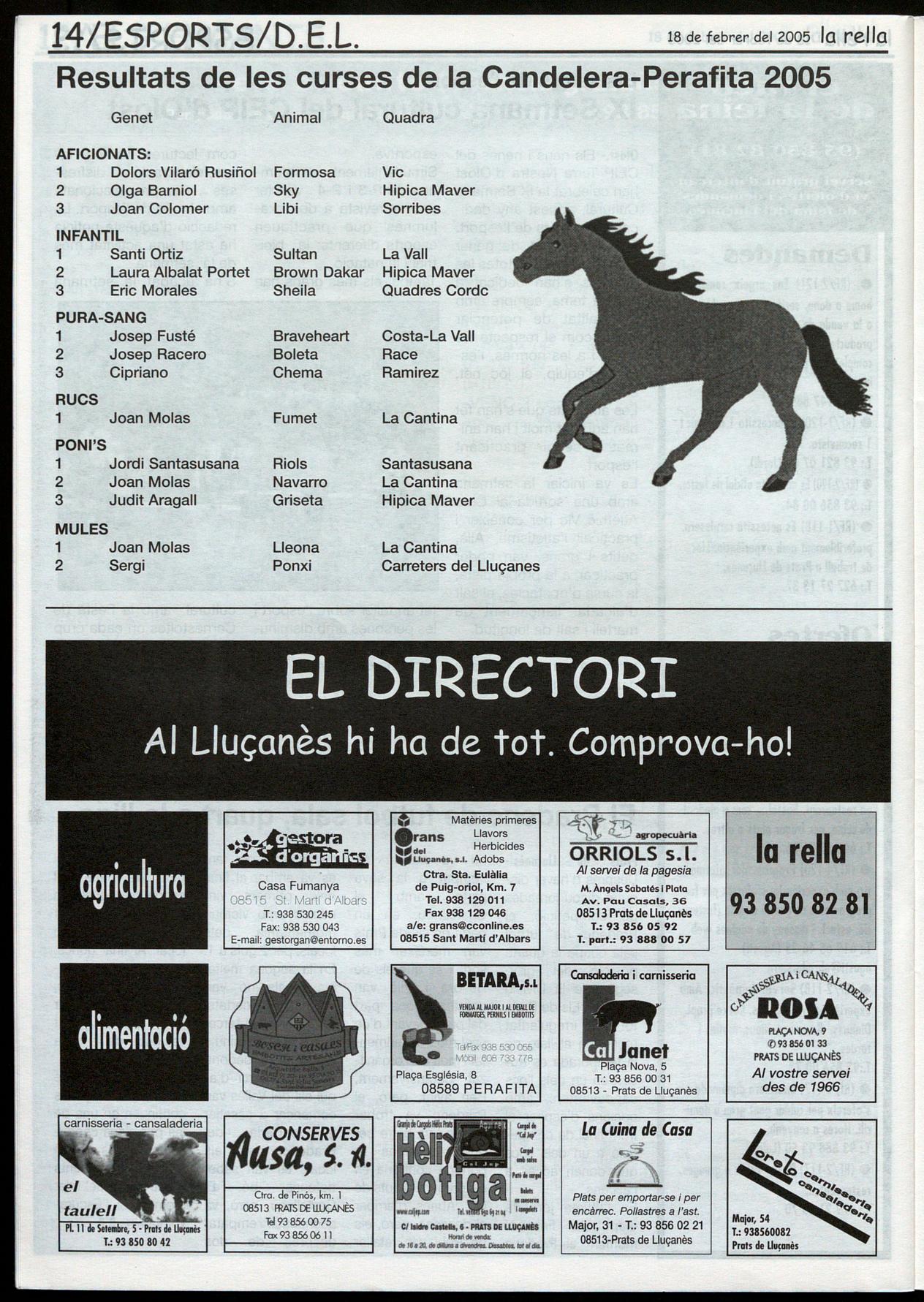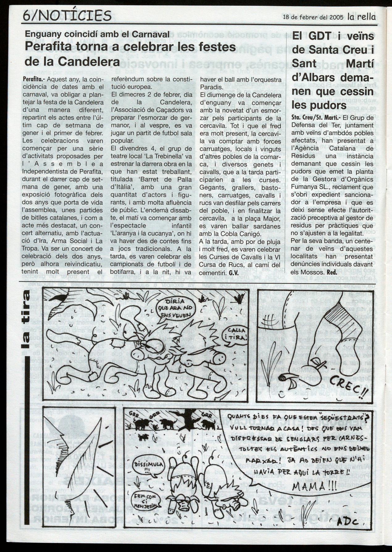 haver el ball amb l'orquestra Paradis. El diumenge de la Candelera d'enguany va començar amb la novetat d'un esmorzar pels participants de la cercavila. Tot i que el fred era molt present, la cercavila va comptar amb forces carruatges, locals i vinguts d'altres pobles de la comarca, diversos genets cavalls, que a la tarda participarien a les curses. Gegants, grallers, bastoners, carruatges, cavalls rucs van desfilar pels carrers del poble, en finalitzar la cercavila, a la plaça Major, es varen bailar sardanes amb la Cobla Canigó. A la tarda, amb por de pluja molt fred, es varen celebrar les Curses de Cavalls la VI Cursa de Rucs, al camí del cementiri. G.V.