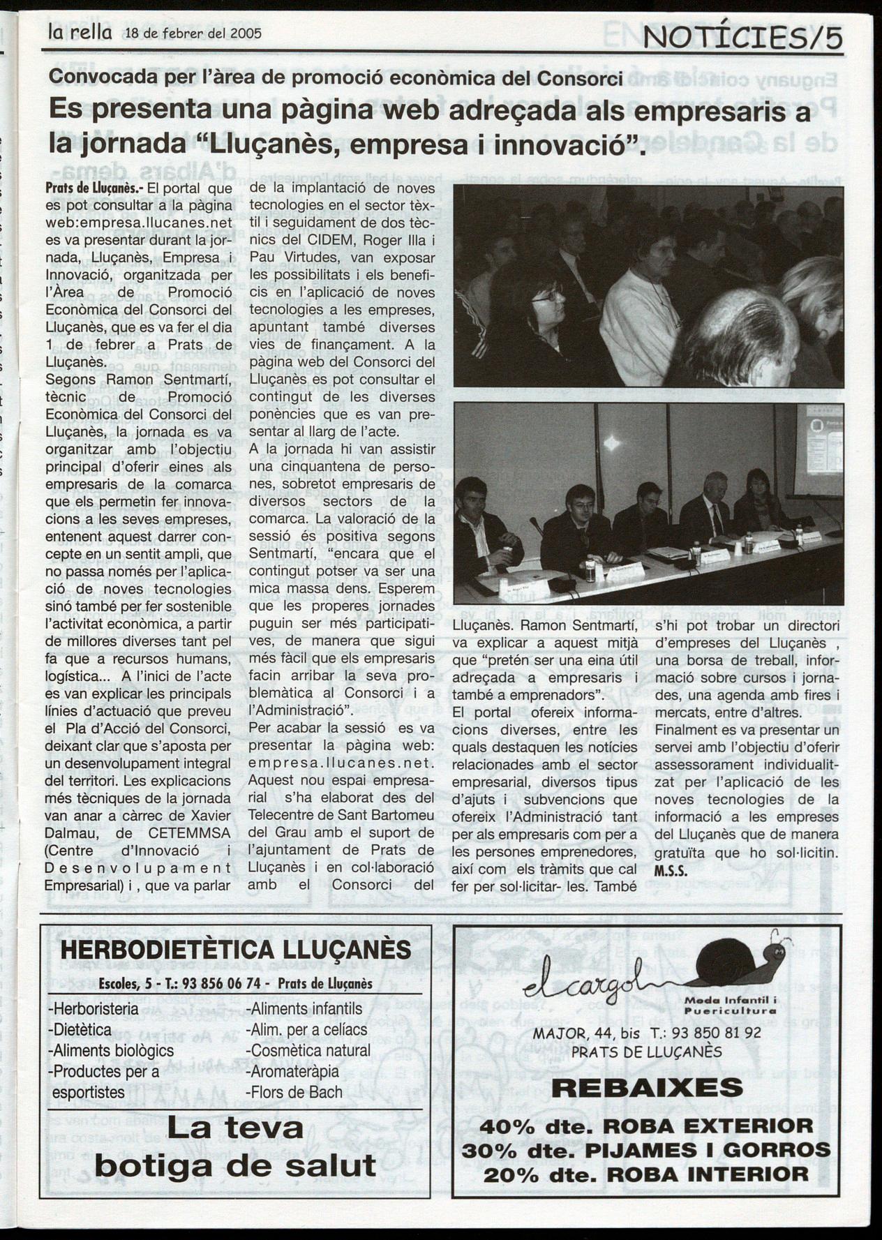 Prats de Llúsanès.- El portal que es pot consultar a la pàgina web.empresa.llucanes.net es va presentar durant la jornada, Lluçanès, Empresa Innovació, organitzada per l'Àrea de Promoció Econòmica del Consorci del Lluçanès, que es va fer el dia 1 de febrer. a Prats, de Lluçanès.