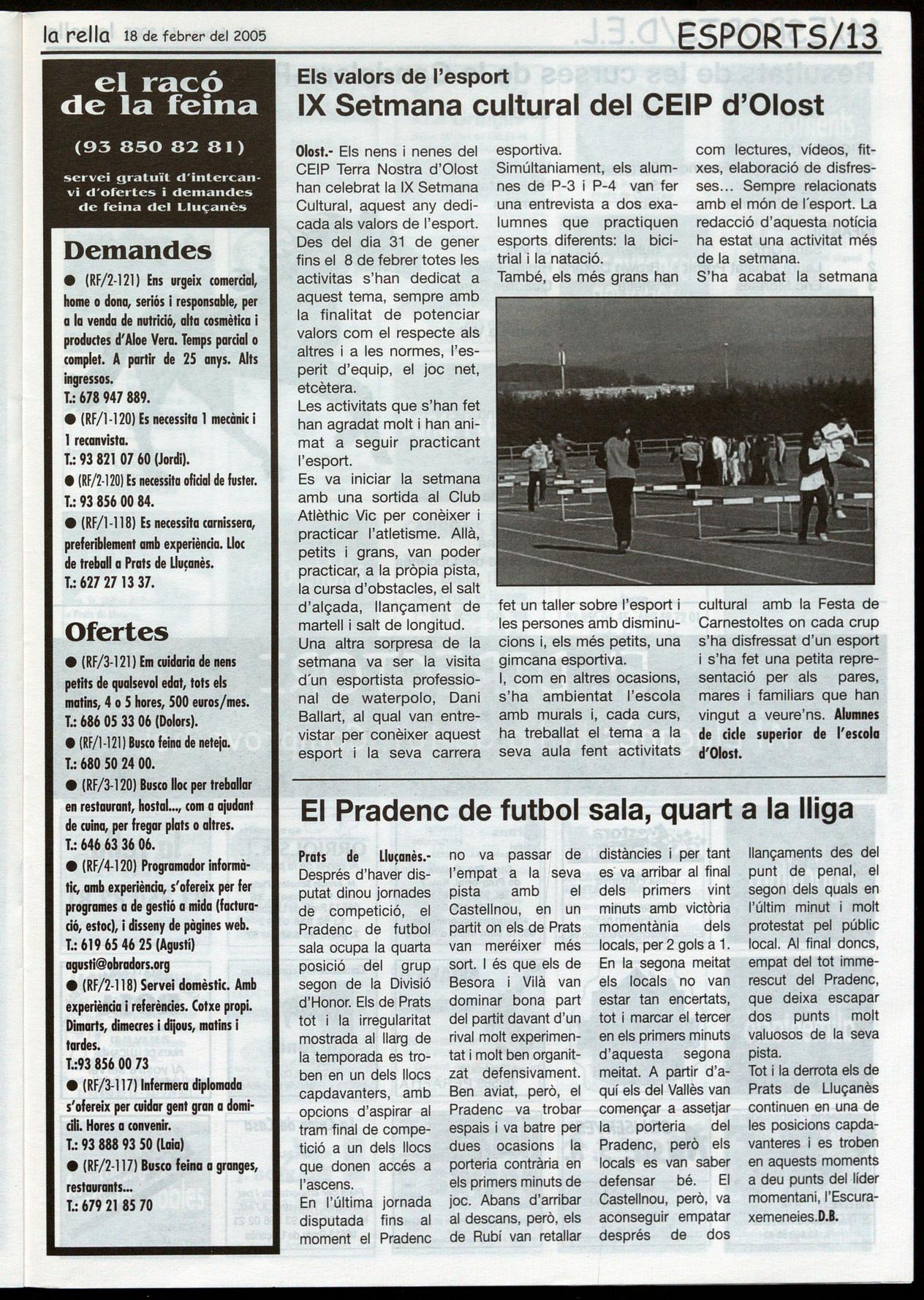 Olost.- Els nens i nenes del CEIP Terra Nostra d'Olost han celebrat la IX Setmana Cultural, aquest any dedicada als valors de l'esport. Des del dia 31 de gener fins el 8 de febrer totes les activitas s'han dedicat a aquest tema, sempre amb la finalitat de potenciar valors com el respecte als altres i a les normes, l'esperit d'equip, el joc net, etcètera.