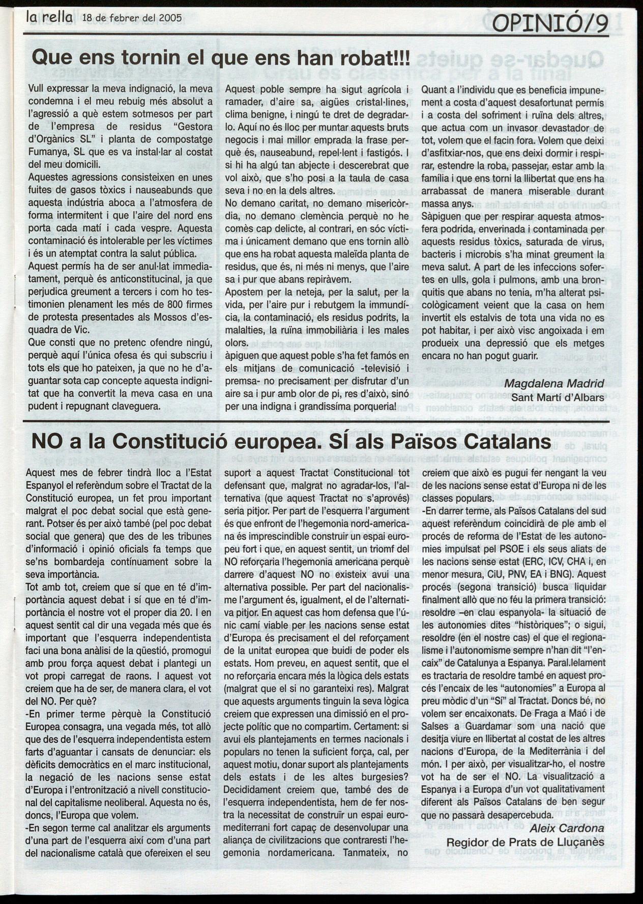 Sta. Creu/St. Martí.- El Grup de Defensa del Ter, juntament amb veïns d'ambdós pobles afectats, han presentat a I'Agència Catalana de Hesidus una instància demanant que cessin les pudors que emet la planta de la Gestora d'Orgànics Fumanya SL., reclament que s'obri expedient sancionador a l'empresa i que es deixi sense efecte l'autorització preceptiva al gestor de residus per pràctiques que no s'ajusten a la legalitat. Per la seva banda, un centenar de veïns d'aquestes localitats han presentat denúncies individuals davant els Mossos. Red.