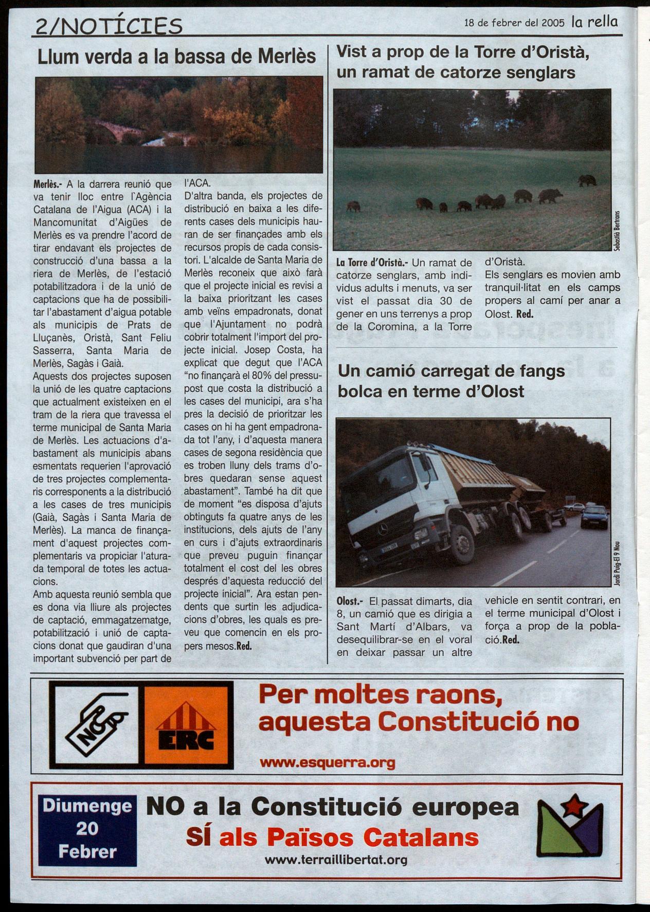 Merlès.- A la darrera reunió que va tenir lloc entre l'Agència Catalana de l'Aigua (ACA) la Mancomunitat d'Aigües de Merlès es va prendre l'acord de tirar endavant els projectes de construcció d'una bassa a la riera de Merlès, de l'estació potabilitzadora ,i de la unió de captacions que ha de possibilitar l'abastament d'aigua potable als municipis de Prats de Lluçanès, Oristà, Sant Feliu Sasserra, Santa Maria de Merlès, Sagàs i Gaià.