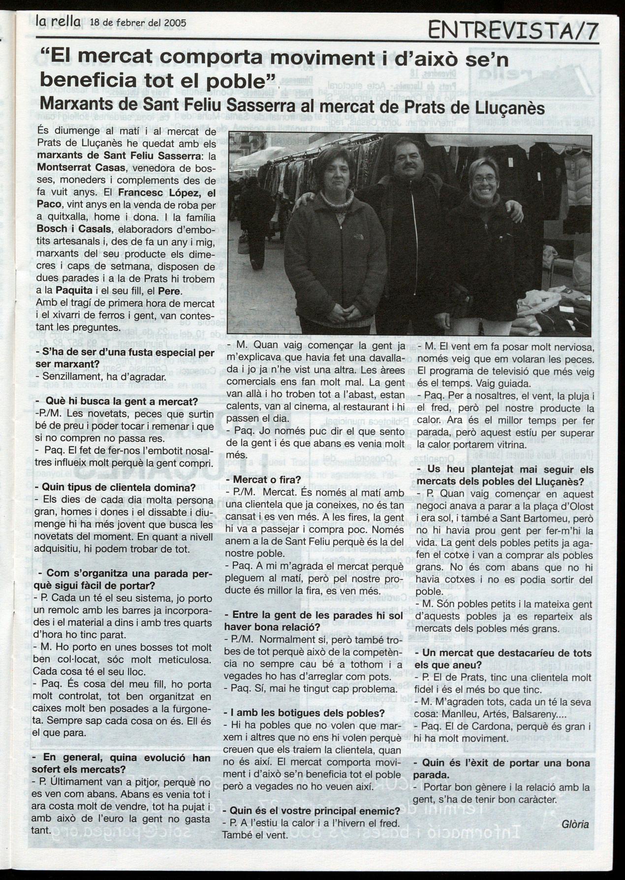 És diumenge al matí al mercat de Prats de Lluçanès he quedat amb els marxants de Sant Feliu Sasserra: la Montserrat Casas, venedora de bosses, moneders complements des de fa vuit anys. El Francesc López, el Paco, vint anys en la venda de roba per a quitxalla, home i dona. I la família Bosch i Casals, elaboradors d'embotits artesanals i, des de fa un any i mig, marxants del seu producte els dimecres i caps de setmana, disposen de dues parades i a la de Prats hi trobem a la Paquita el seu fill, el Pere. Amb el tragí de primera hora de mercat el xivarri de ferros gent, van contestant les preguntes.