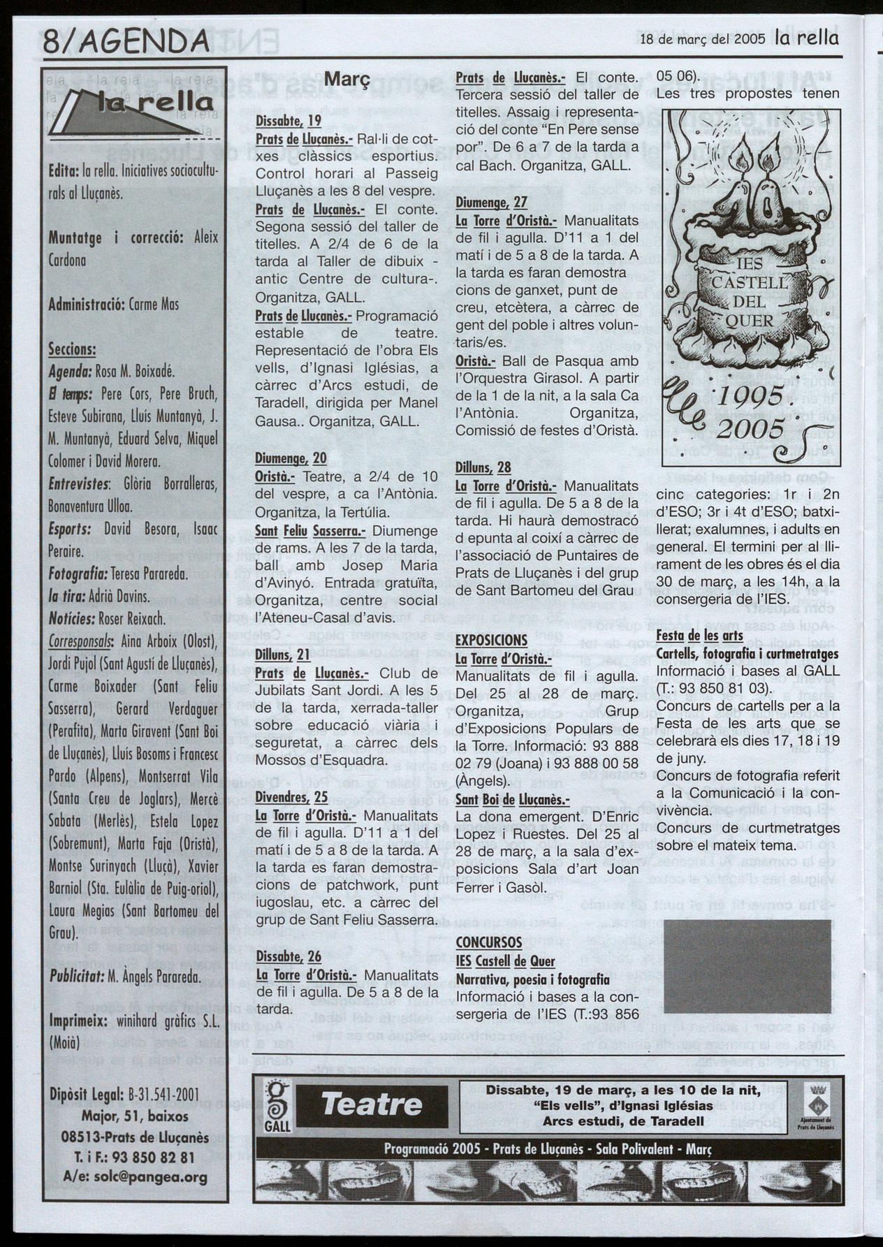 MANUALITATS DE FIL I AGULLA A LA TORRE D'ORISTÀ." El grup d'Exposicions populars ja ha començat a organitzar l'exposició que com cada any fan per Setmana Santa i que enguany, en la seva catorzena edició, estarà dedicada a Manualitats de fil agulla. Entre d'altres, hi participaran l'agrupació sociocultural La dona, de Sant Feliu Sasserra, l'associació de Puntaires de Prats de Lluçanès, l'associació de dones Sajolida, de Sant Bartomeu del Grau, així com representants de Sant Boi de Lluçanès, Santa Eulàlia de Puig-oriol, Oristà i la Torre. Les modalitats exposades seran patchwork, punta al coixí, ganxet, punt de creu, punt iugoslau, macramé, richelieu, frivolité, etcètera. Durant els dies de l'exposició, del 25 al 28 de març, hi haurà tallers de demostració de les diferents tècniquesJ.S.