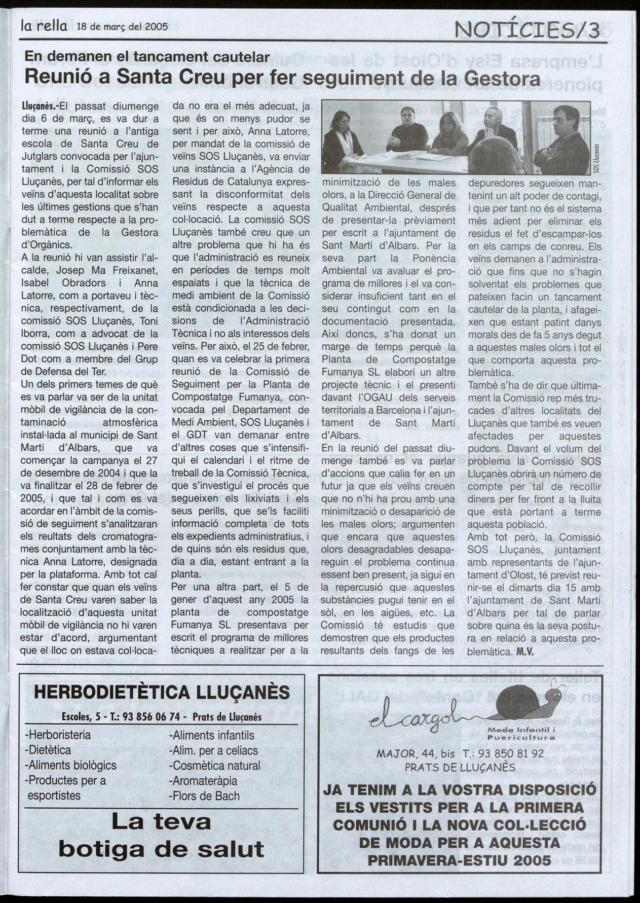 da no era el més adecuat, ja que és on menys pudor se sent per això, Anna Latorre, per mandat de la comissió de veïns SOS Lluçanès, va enviar una instància a l'Agència de Residus de Catalunya expressant la disconformitat dels veïns respecte a aquesta col·locació. La comissió SOS Lluçanès també creu que un altre problema que hi ha és que l'administració es reuneix en períodes de temps molt espaiats que la tècnica de medi ambient de la Comissió està condicionada a les decisions de l'Administració Tècnica i no als interessos dels veïns. Per això, el 25 de febrer, quan es va celebrar la primera reunió de la Comissió de Seguiment per la Planta de Compostatge Fumanya, convocada pel Departament de Medi Ambient, SOS Lluçanès el GOT van demanar entre d'altres coses que s'intensifiqui el calendari el ritme de treball de la Comissió Tècnica, que s'investigui el procés que segueixen els lixiviats els seus perills, que se'ls faciliti informació completa de tots els expedients administratius, i de quins són els residus que, dia a dia, estant entrant a la planta.