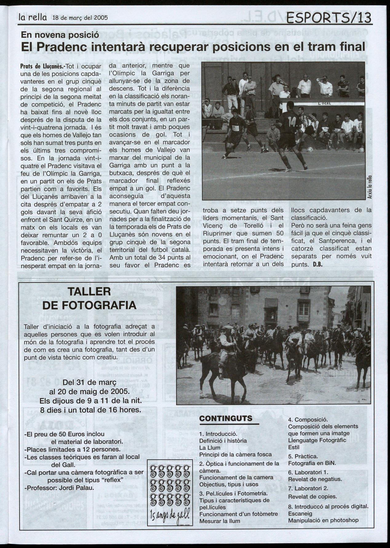 da anterior, mentre que l'Olímpic la Garriga per allunyar-se de la zona de descens. Tot la diferència en la classificació els noranta minuts de partit van estar marcats per la igualtat entre els dos conjunts, en un partit molt travat i amb poques ocasions de gol. Tot avançar-se en el marcador els homes de Vallejo van marxar del municipal de la Garriga amb un punt a la butxaca, després de què el marcador final reflexés empat a un gol. El Pradenc aconseguia d'aquesta manera el tercer empat consecutiu. Quan falten deu jornades per a la finalització de la temporada els de Prats de Lluçanès són novens en el grup cinquè de la segona territorial del futbol català. Amb un total de 34 punts al seu favor el Pradenc es