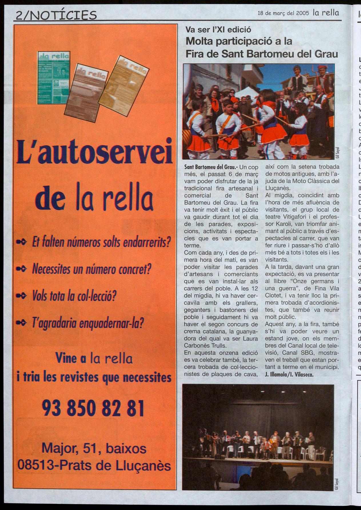 Sant Bartomeu del Grau.- Un cop més, el passat 6 de març vam poder disfrutar de la ja tradicional fira artesanal i comercial de Sant Bartomeu del Grau. La fira va tenir molt èxit i el públic va gaudir durant tot el dia de les parades, exposicions, activitats espectacles que es van portar a terme.