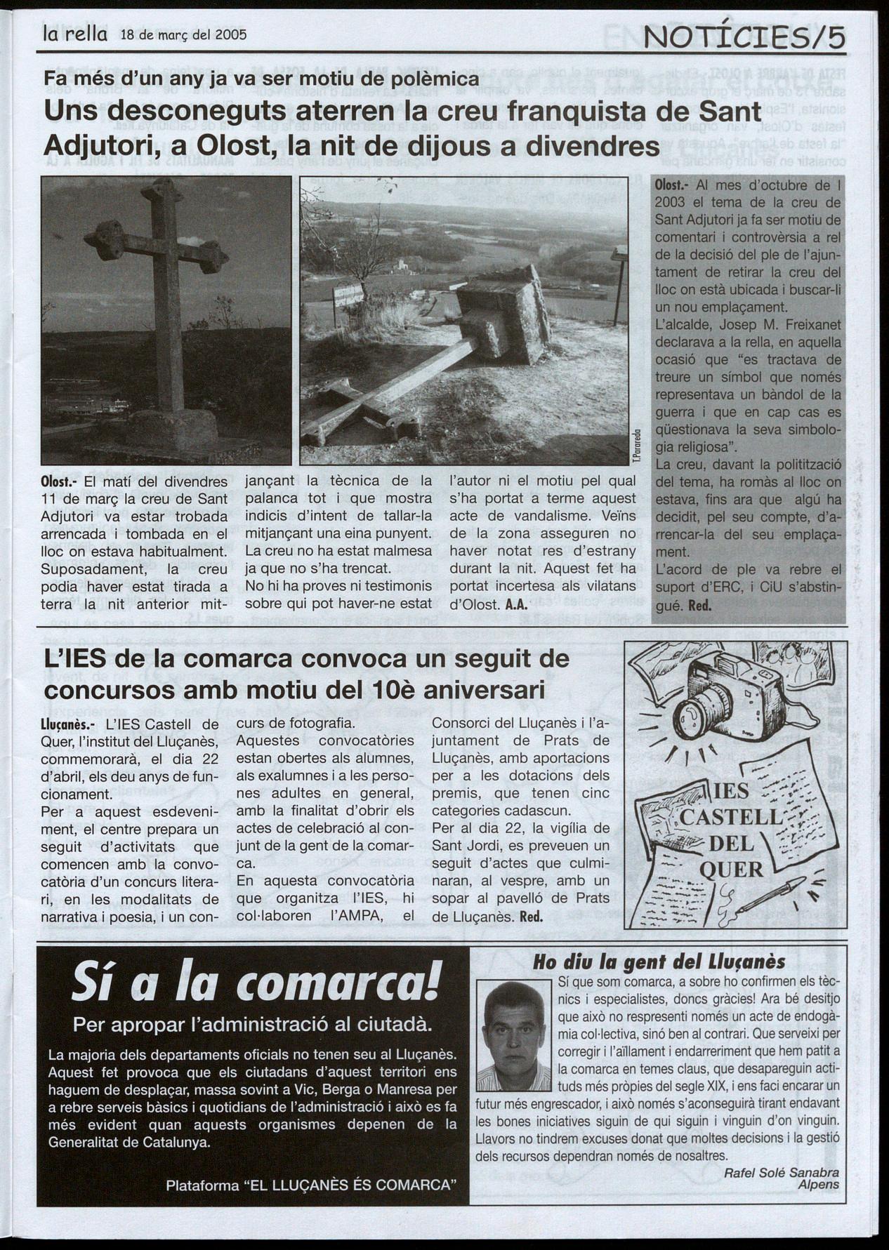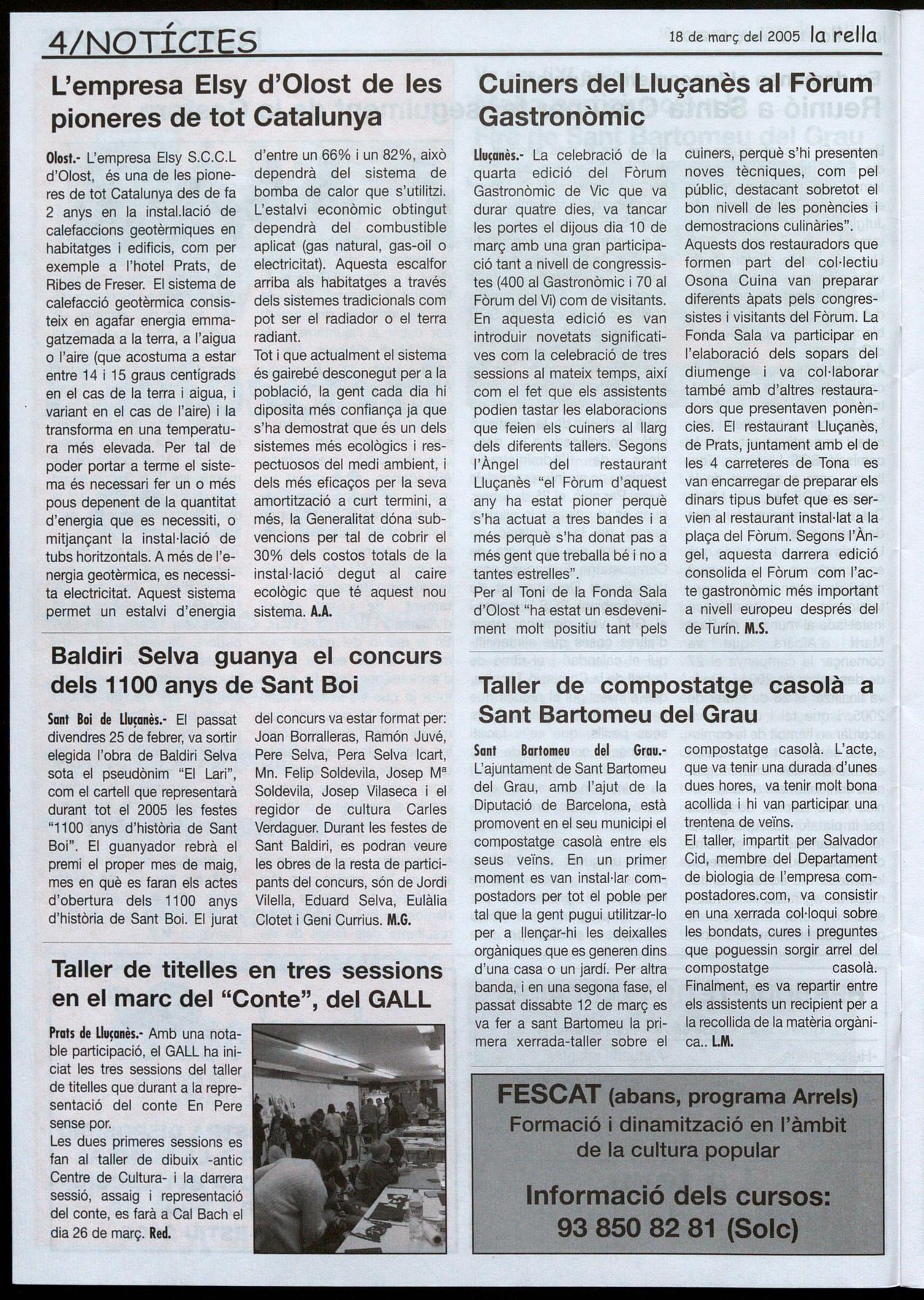 FESTA DE L'ARBRE A OLOST." El dissabte 13 de març el grup excursionista, l'Esplai la regidoria de festes d'Olost, van organitzar "la festa de l'arbre". Aquesta va consistir en fer una gimcana per grups amb els petits del poble. A través de la gimcana s'havien de trobar pistes per tal de saber on estaven els arbres que s'havien de plantar. Un cop trobats es van plantar al trencant direcció a la zona esportiva d'Olost, com a premi, es va donar berenar a tots els participants. Amb aquesta activitat es pretén incentivar als xics a conèixer i gaudir de la natura d'una manera divertida. A.A.