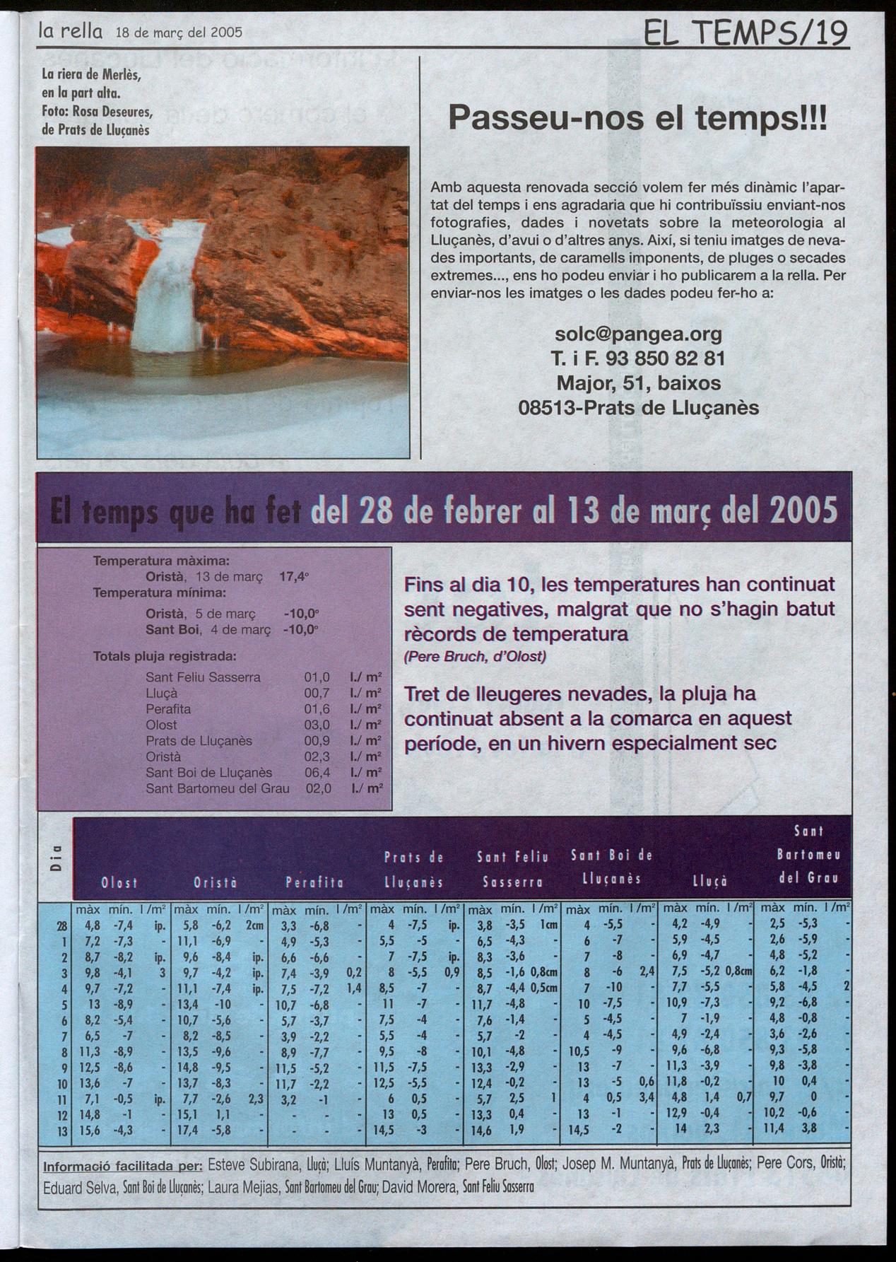 Amb aquesta renovada secció volem fer més dinàmic l'apartat del temps i ens agradaria que hi contribuïssiu enviant-nos fotografies, dades i novetats sobre la meteorologia al Lluçanès, d'avui a d'altres anys. Així, si teniu imatges de nevades importants, de caramells imponents, de pluges a secades extremes ens ho podeu enviar i ho publicarem a la rella. Per enviar-nos les imatges a les dades podeu fer-ho a: