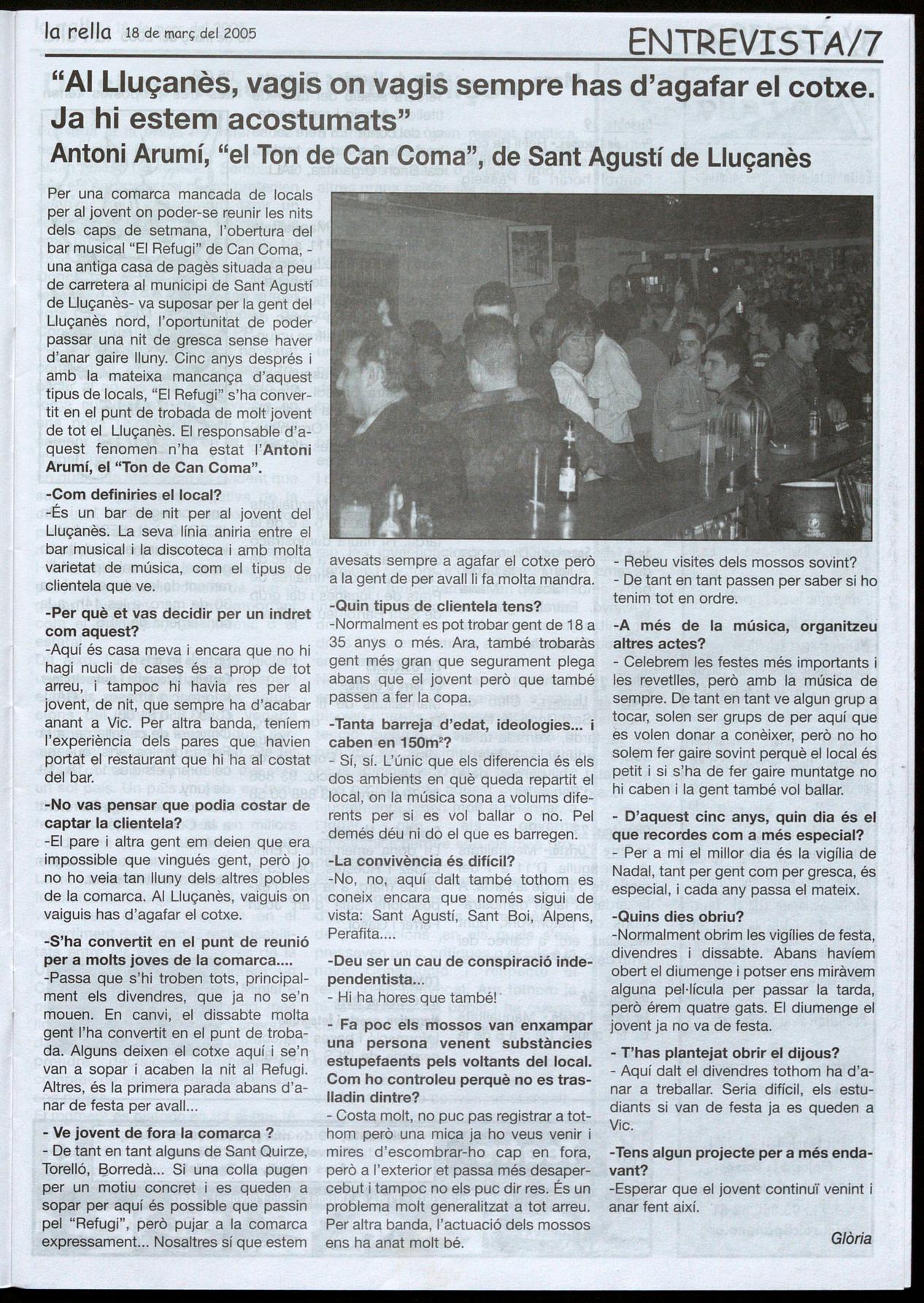 Per una comarca mancada de locals per al jovent on poder-se reunir les nits dels caps de setmana, l'obertura del bar musical "El Refugi" de Can Coma,una antiga casa de pagès situada a peu de carretera al municipi de Sant Agustí de L1uçanès- va suposar per la gent del Lluçanès nord, l'oportunitat de poder passar una nit de gresca sense haver d'anar gaire lluny. Cinc anys després i amb la mateixa mancança d'aquest tipus de locals, "El Refugi" s'ha convertit en el punt de trobada de molt jovent de tot el Lluçanès. El responsable d'aquest fenomen n'ha estat l'Antoni Arumí, el "Ton de Can Coma".