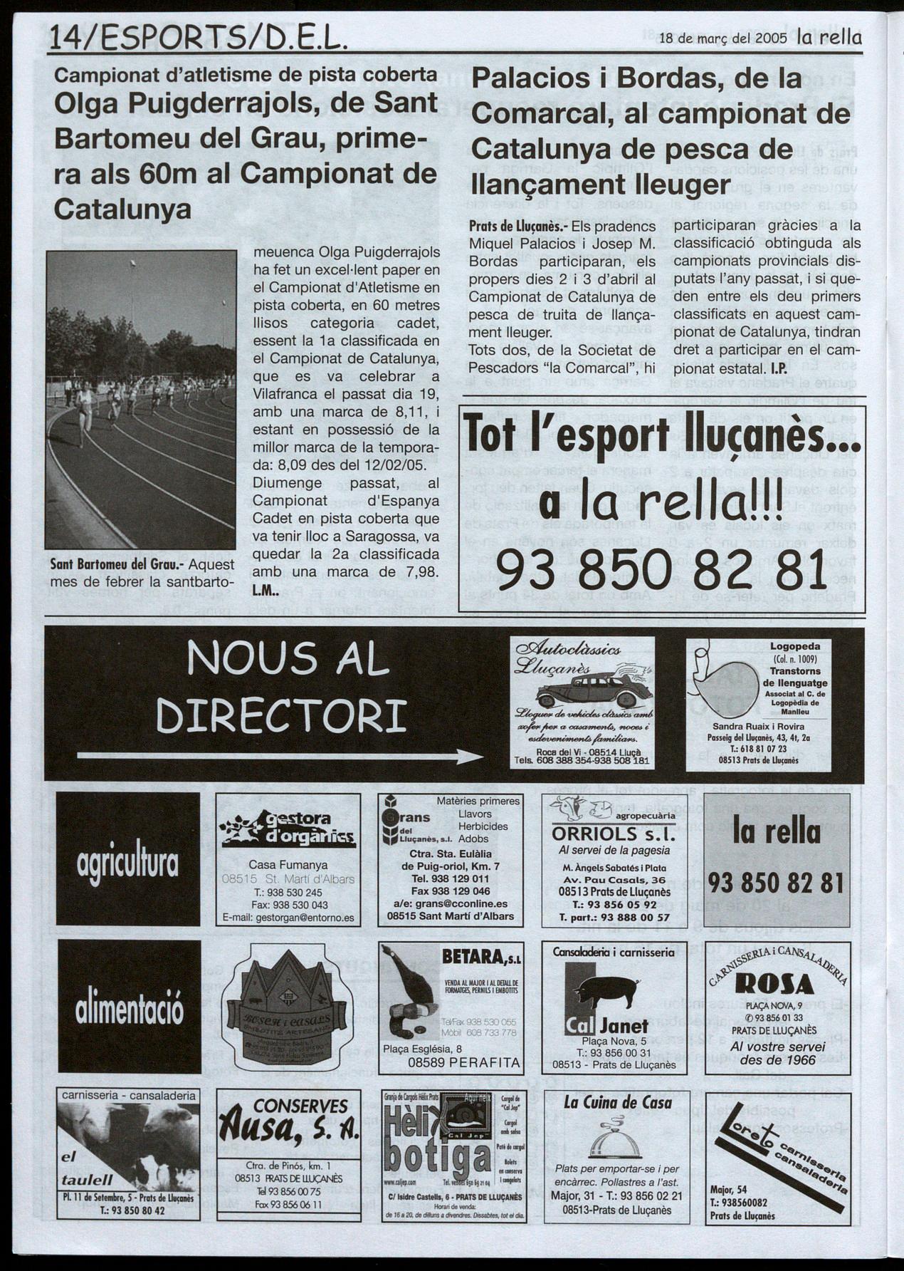 meuenca Olga Puigderrajols ha fet un excel· lent paper en el Campionat d'Atletisme en pista coberta, en 60 metres llisos categoria cadet, essent la 1 a classificada en el Campionat de Catalunya, que es va celebrar a Vilafranca el passat dia 19, amb una marca de 8,11, i estant en possessió de la millor marca de la temporada: 8,09 des del 12/02/05. Diumenge passat, al Campionat d'Espanya