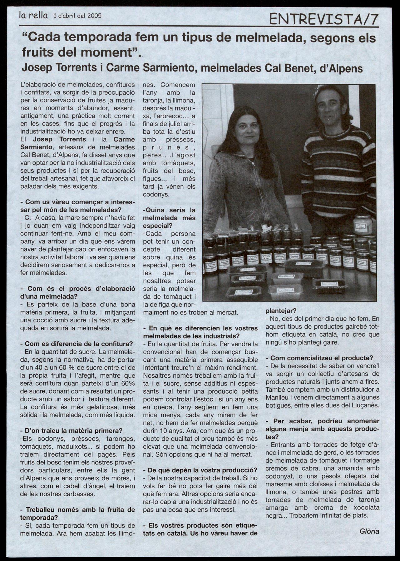 L'elaboració de melmelades, confitures i confitats, va sorgir de la preocupació per la conservació de fruites ja madures en moments d'abundor, essent, antigament, una pràctica molt corrent en les cases, fins que el progrés i la industrialització ho va deixar enrere. El Josep Torrents i la Carme Sarmiento, artesans de melmelades Cal Benet, d'Alpens, fa disset anys que van optar per la no industrialització dels seus productes sí per la recuperació del treball artesanal, fet que afavoreix el paladar dels més exigents.