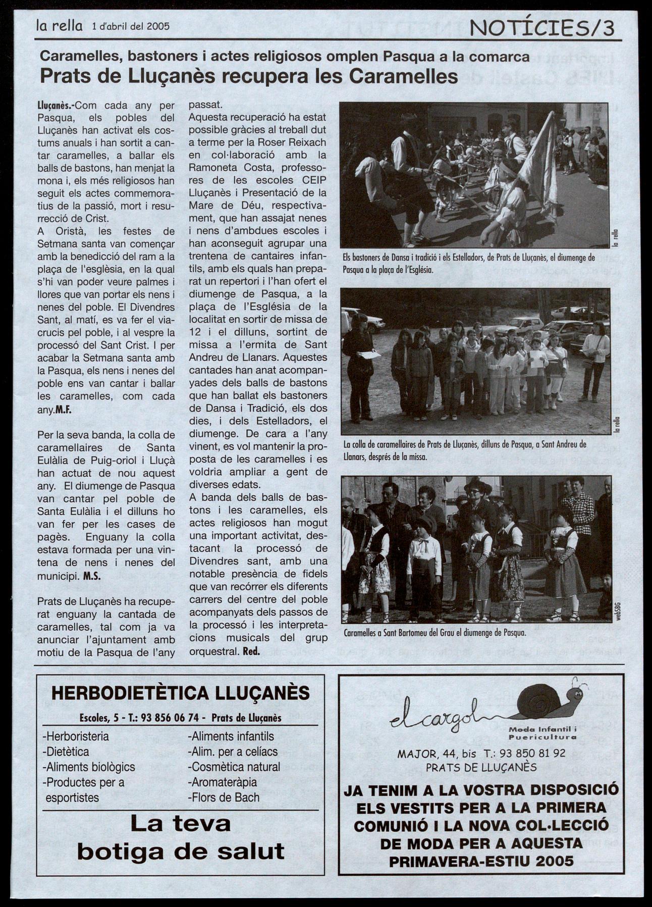 Llu�anès.-Com cada any per Pasqua, els pobles del Lluçanès han activat els costums anuals han sortit a cantar caramelles, a ballar els balls de bastons, han menjat la mona i, els més religiosos han seguit els actes commemoratius de la passió, mort i resurrecció de Crist.