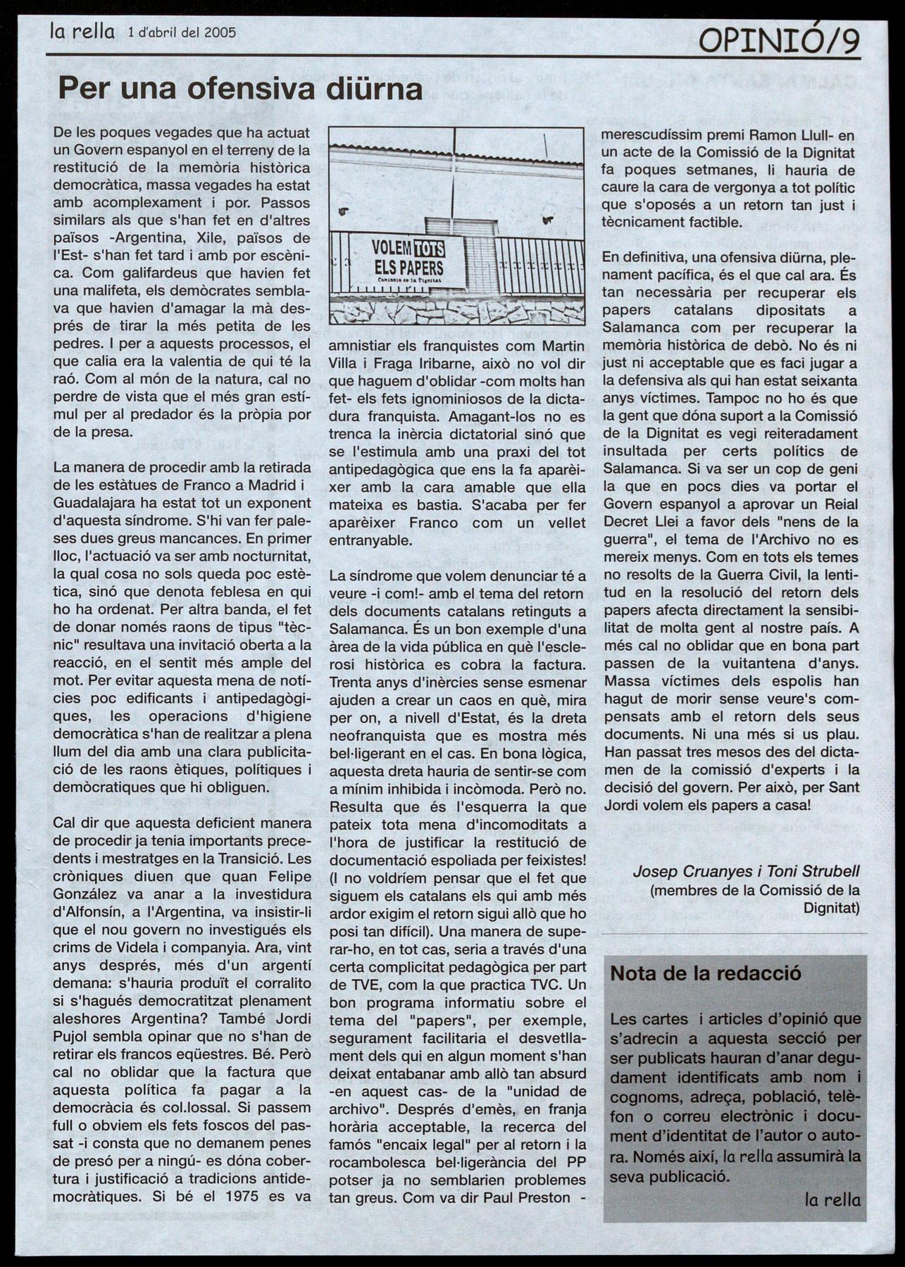 Sovint t'entren ganes de revisar el sentit de la teva feina. És una necessitat ineludible que et tranquíl-lítza i, a vegades, et dóna nous ànims per tirar endavant. La meva feina és dirigir un centre de secundària, que no és poca aventura. En aquestes ocasions, seguint un estricte ordre de coses, em puc perdre confonent les realitats amb les intencions: que si la qualitat, que si l'ordre i la disciplina, que si les relacions amb els pares, els alumnes i les autoritats corresponents. I tot d'una, t'apareix el "que si la convivència amb una força que supera totes les previsions d'una anàlisi sistemàtica ¿Serà aquesta la clau de volta de tota la nostra raó de ser? El sentit comú m'ensenya que no s'ha de focalitzar tant la nostra atenció en un sol aspecte, però m'hi aturo una miqueta i hi veig ombres i llums. Un bon panorama.