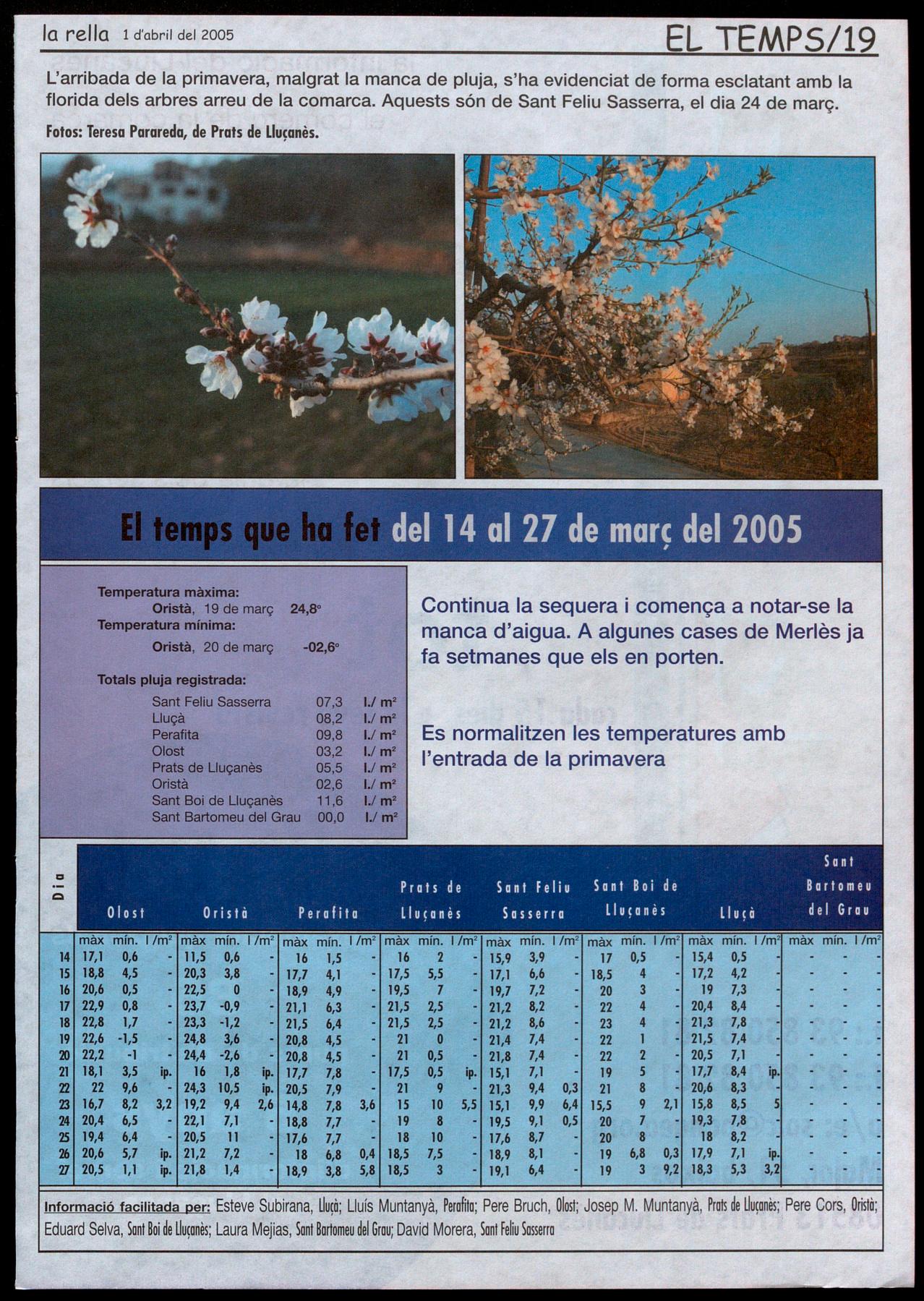 L'arribada de la primavera, malgrat la manca de pluja, s'ha evidenciat de forma esclatant amb la florida dels arbres arreu de la comarca. Aquests són de Sant Feliu Sasserra, el dia 24 de març. Fotos: Teresa Parareda, de Prats de Llu�anès.