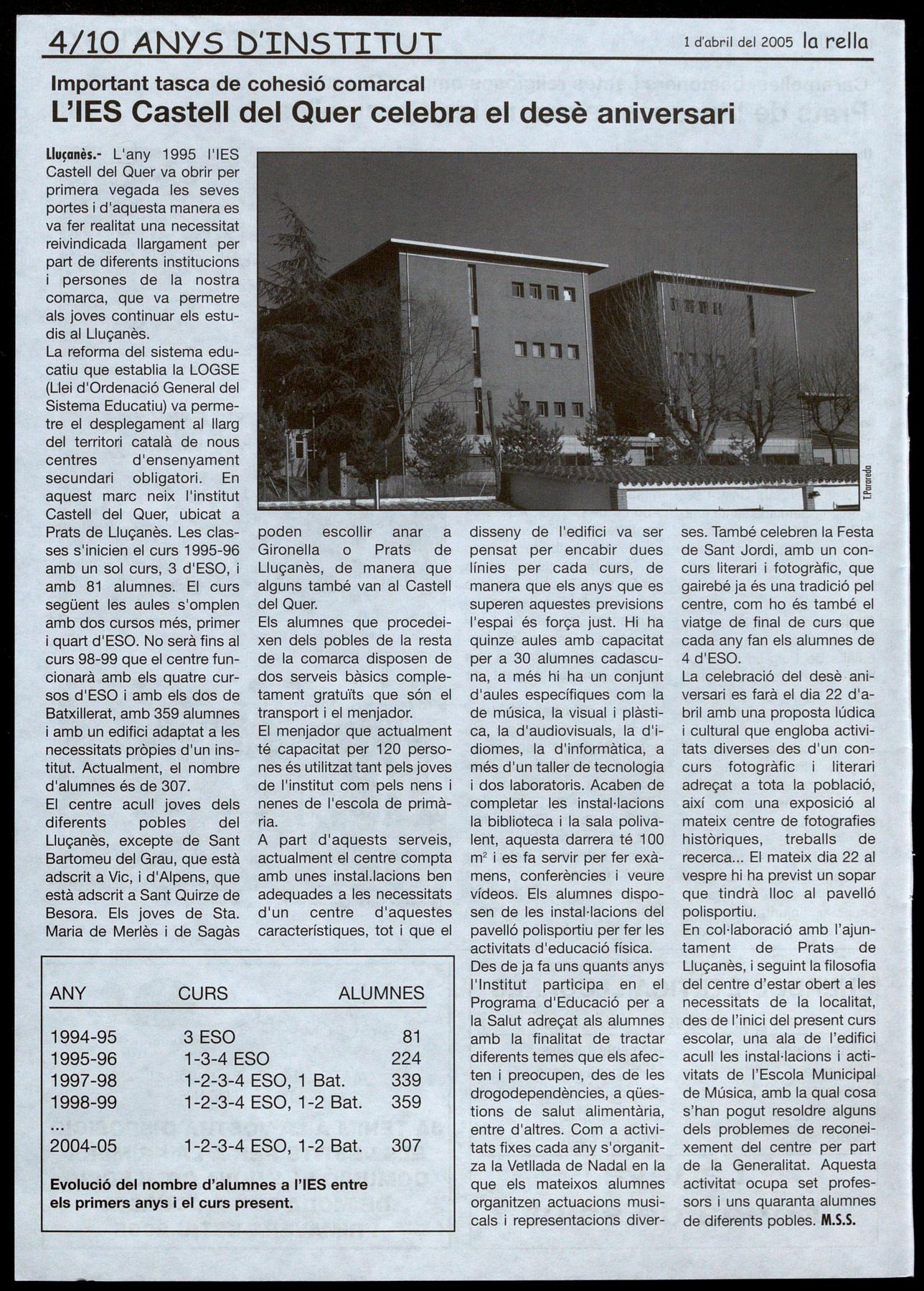 Castell del Quer, ubicat a Prats de Lluçanès. Les classes s'inicien el curs 1995-96 amb un sol curs, 3 d'ESO, i amb 81 alumnes. El curs següent les aules s'omplen amb dos cursos més, primer i quart d'ES�. No serà fins al curs 98-99 que el centre funcionarà amb els quatre cursos d'ESO amb els dos de Batxillerat, amb 359 alumnes i amb un edifici adaptat a les necessitats pròpies d'un institut. Actualment, el nombre d'alumnes és de 307.