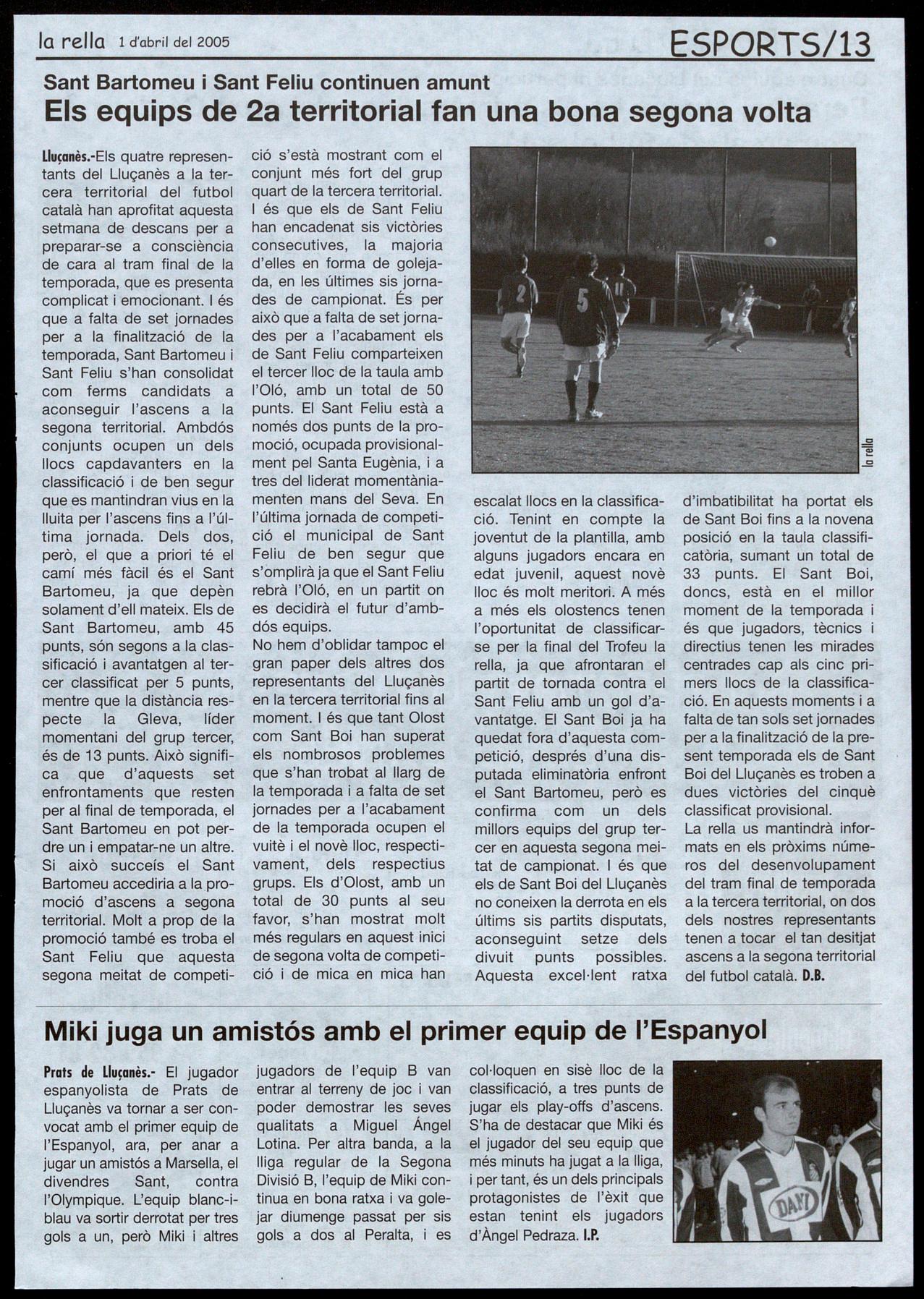 escalat llocs en la classificació. Tenint en compte la joventut de la plantilla, amb alguns jugadors encara en edat juvenil, aquest novè lloc és molt meritori. A més a més els olostencs tenen l'oportunitat de classificarse per la final del Trofeu la rella, ja que afrontaran el partit de tornada contra el Sant Feliu amb un gol d'avantatge. El Sant Boi ja ha quedat fora d'aquesta competició, després d'una disputada eliminatòria enfront el Sant Bartomeu, però es confirma com un deis millors equips del grup tercer en aquesta segona meitat de campionat. I és que els de Sant Boi del Lluçanès no coneixen la derrota en els últims sis partits disputats, aconseguint setze dels divuit punts possibles. Aquesta excel·lent ratxa col·loquen en sisè lloc de la classificació, a tres punts de jugar els play-offs d'ascens. S'ha de destacar que Miki és el jugador del seu equip que més minuts ha jugat a la lliga, per tant, és un dels principals protagonistes de l'èxit que estan tenint els jugadors d'Àngel Pedraza. I.P.