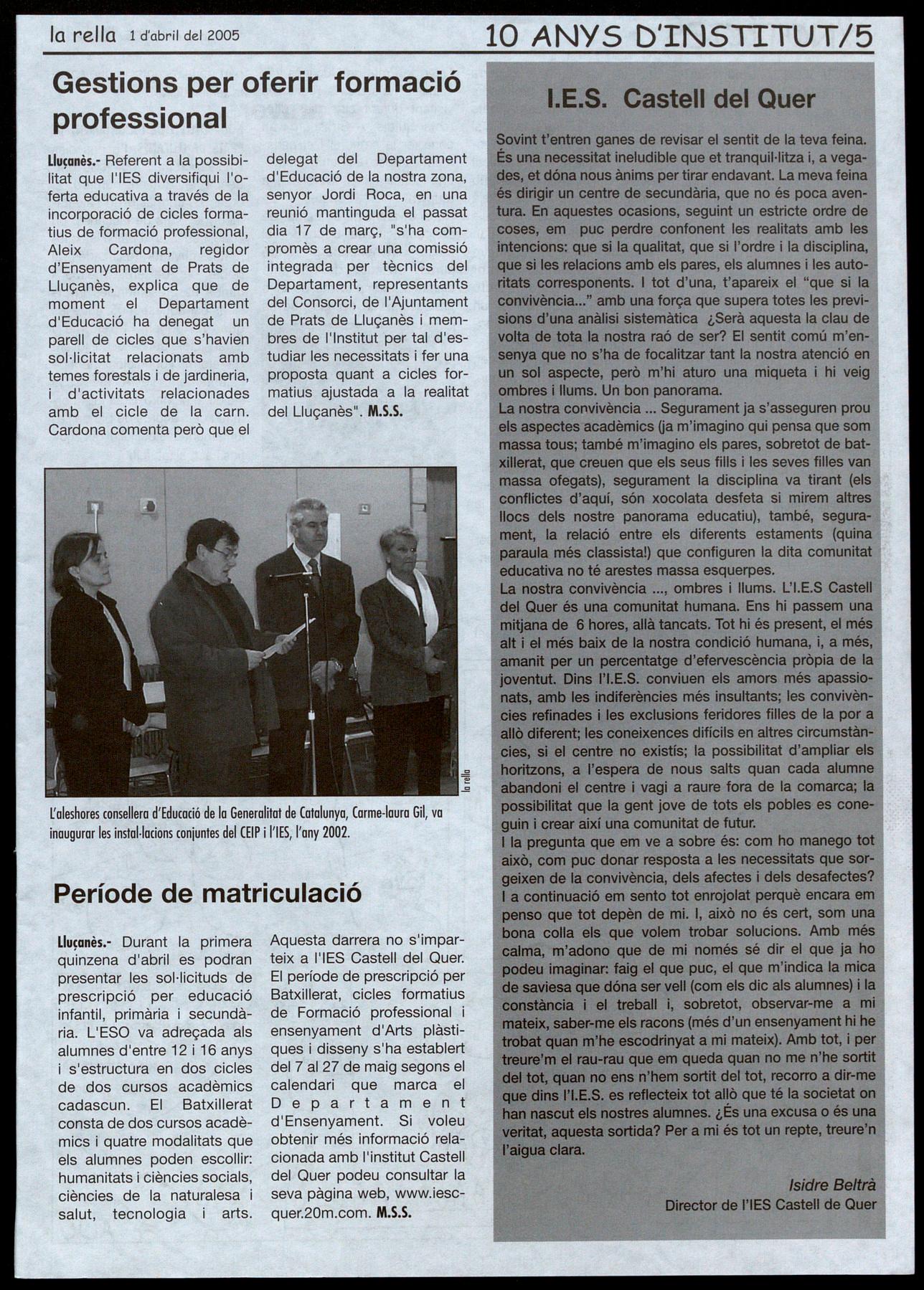 Aquesta darrera no s'imparteix a l'lES Castell del Quer. El període de prescripció per Batxillerat, cicles formatius de Formació professional i ensenyament d'Arts plàstiques i disseny s'ha establert del 7 al 27 de maig segons el calendari que marca el Departament d'Ensenyament. Si voleu obtenir més informació relacionada amb l'institut Castell del Quer podeu consultar la seva pàgina web, www.iescquer.20m.com. M.S.S.