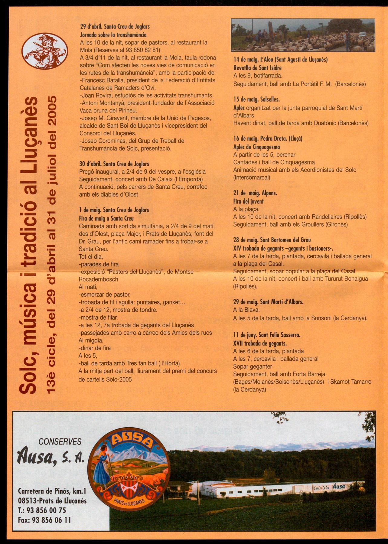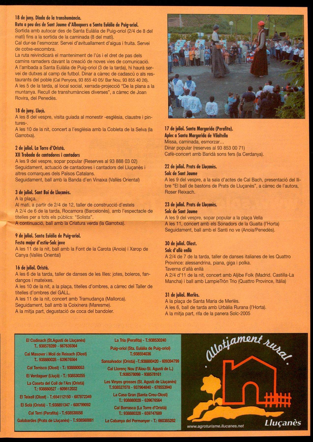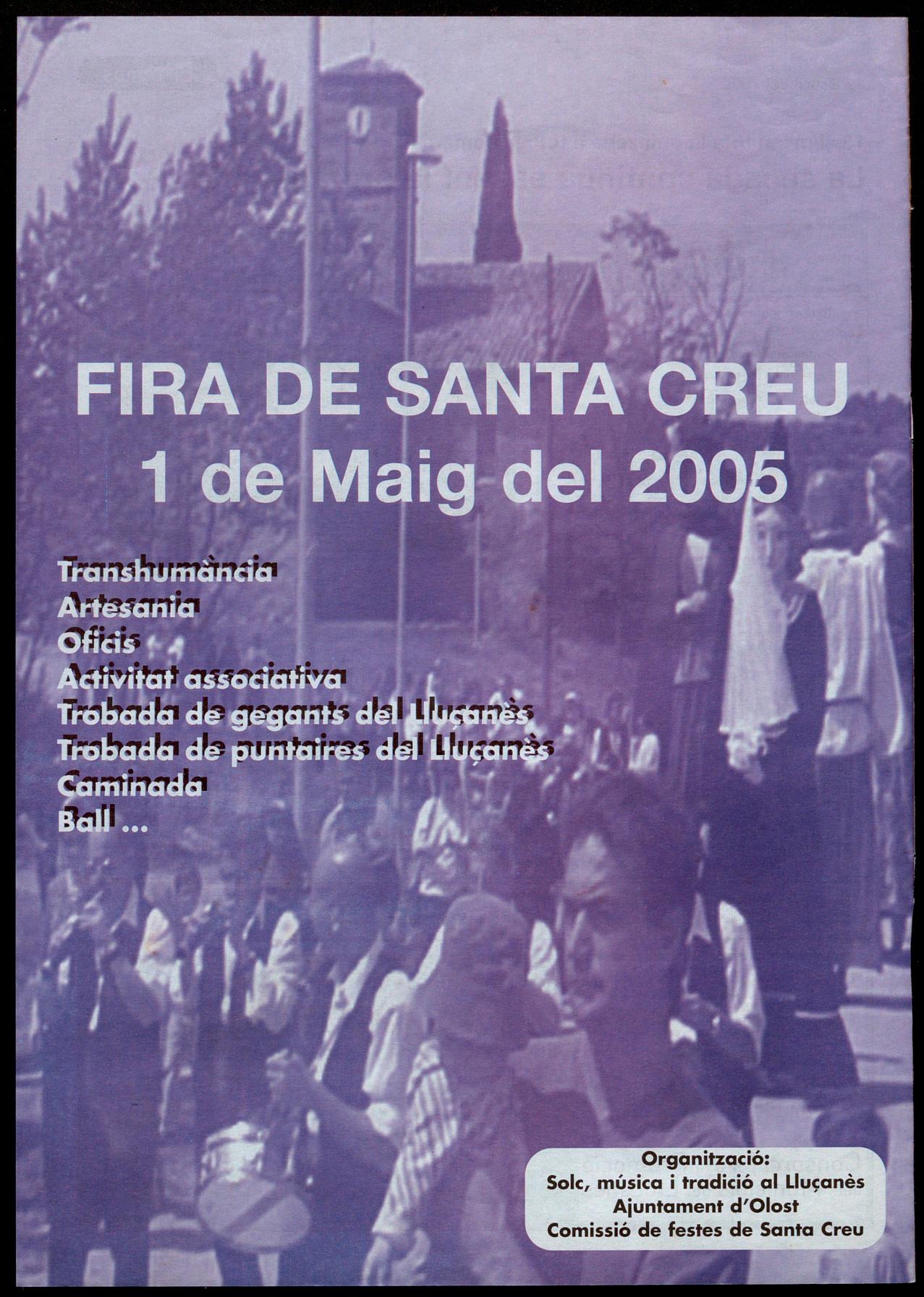 hi haurà mostres diverses de fil agulla, de filar i de tondre. AI matí se sortirà d'Olost i Prats de Lluçanès per seguir el camí ramader fins arribar a Santa Creu i allà es farà un esmorzar de pastor. AI migdia se celebrarà la setena trobada de gegants del Lluçanès a més hi haurà la possibilitat de fer passejades amb carro amb els Amics dels rucs. Després del dinar es farà el ball amb el grup Tres fan ball a la mitja part es donarà el premi del cartell guanyador d'aquesta edició. Cal senyalar que també es podrà visitar l'exposició Pastors del Lluçanès, que fa un any es va donar a conèixer en aquesta fira que des de llavors ha estat present en la majoria de pobles del Lluçanès. Les activitats relacionades amb la transhumància tindran continuïtat el mes de juny, concretament el dia 18, amb una ruta a peu que seguirà el trajecte des de Sant Jaume d'Alboquers a Santa Eulàlia de Puig-oriol. Aquesta ruta es farà per reivindicar l'ús el dret de pas pels camins ramaders davant la construeció de noves vies de comunícació.R.R.