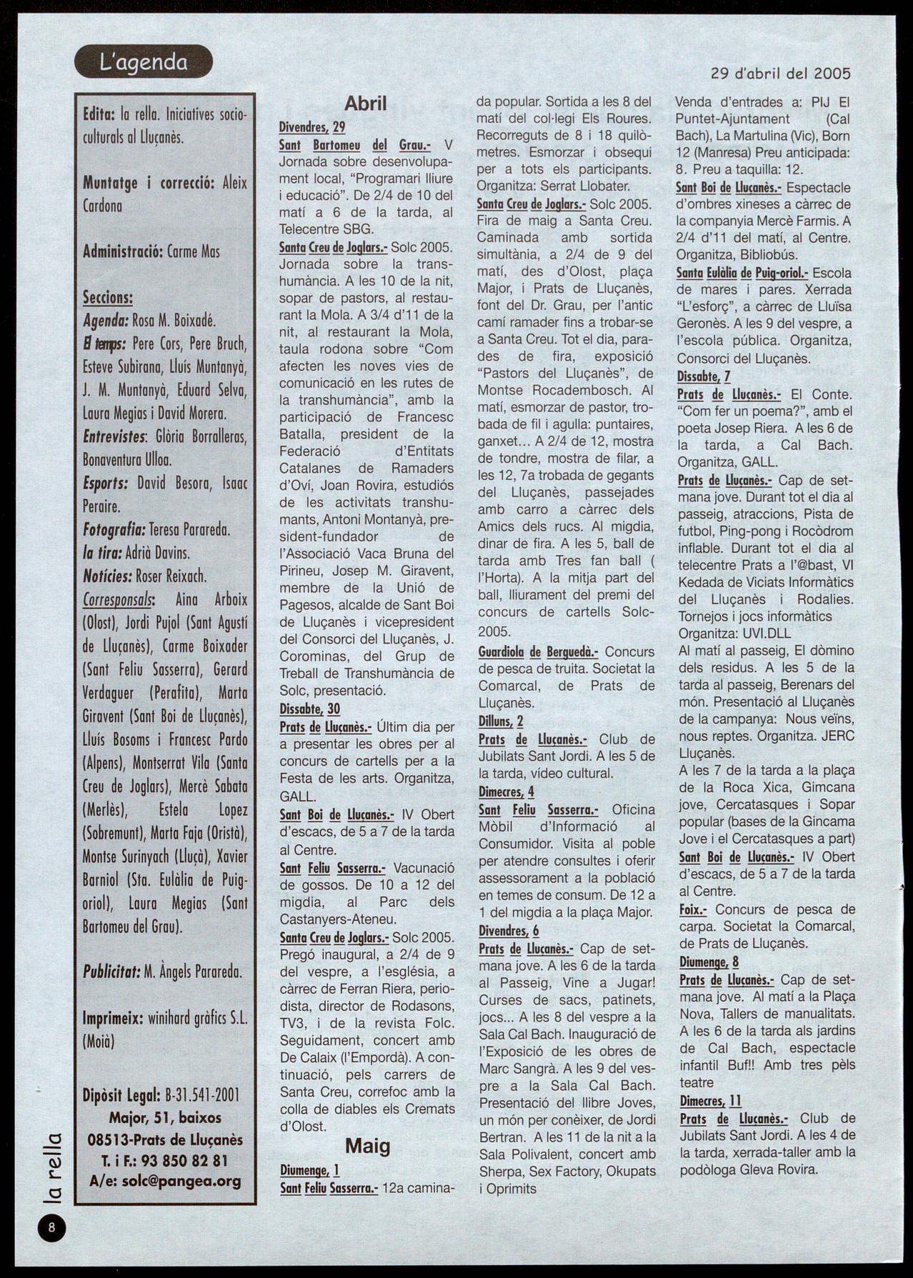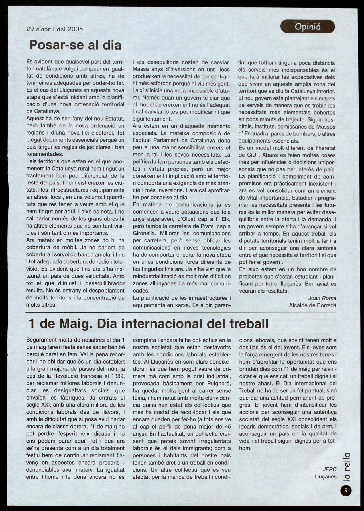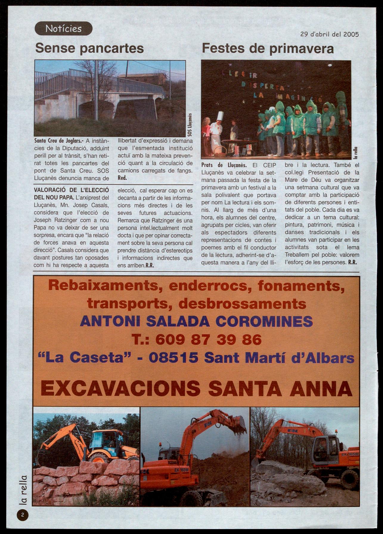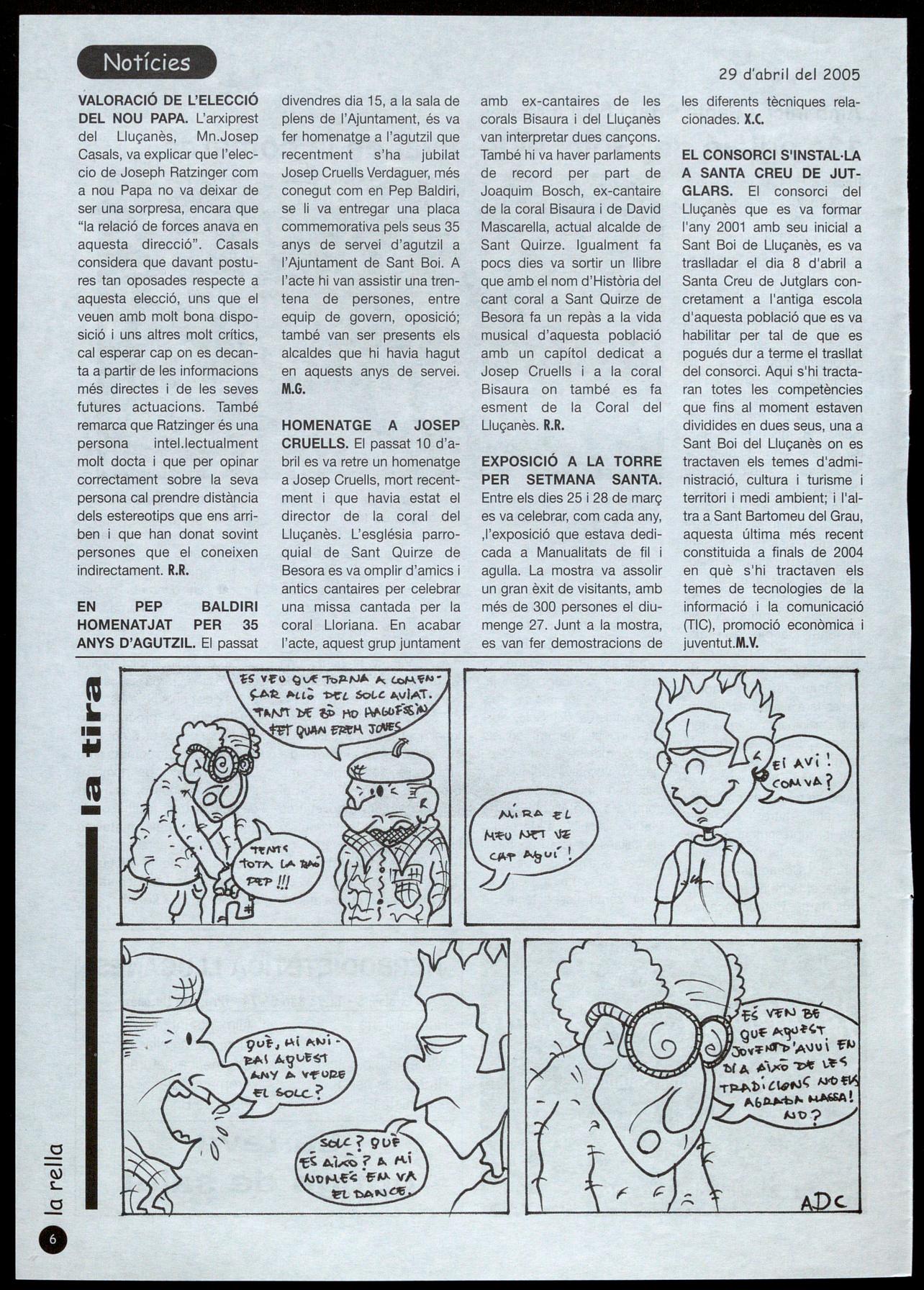 DEL NOU PAPA. L'arxiprest del Lluçanès, Mn.Josep Casals, va explicar que l'éleecio de Joseph Ratzinger com a nou Papa no va deixar de ser una sorpresa, encara que "la relació de forces anava en aquesta direcció". Casals considera que davant postures tan oposades respecte a aquesta elecció, uns que el veuen amb molt bona disposició i uns altres molt crítics, cal esperar cap on es decanta a partir de les informacions més directes de les seves futures actuacions. També remarca que Ratzinger és una persona intel.lectualment molt docta i que per opinar correctament sobre la seva persona cal prendre distància dels estereotips que ens arriben que han donat sovint persones que el coneixen indirectament.