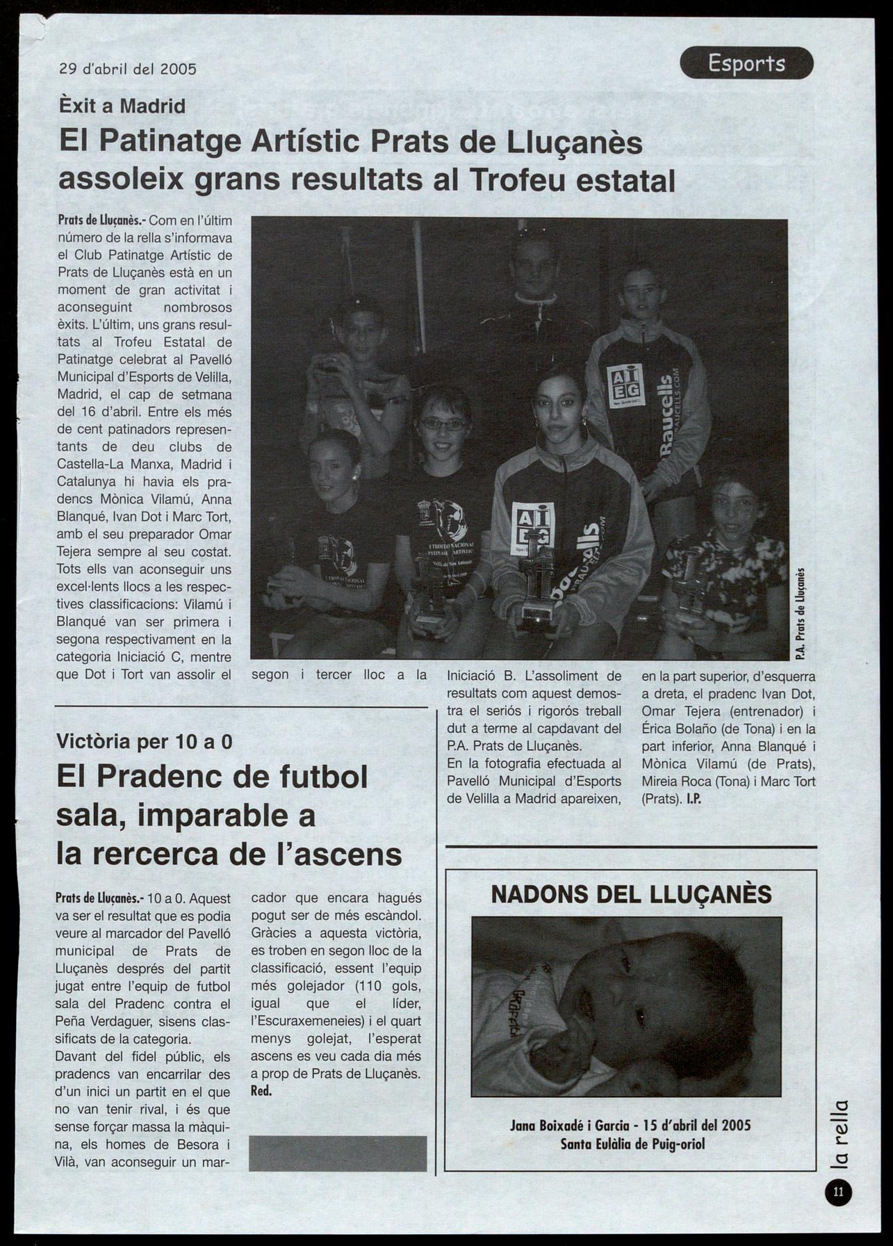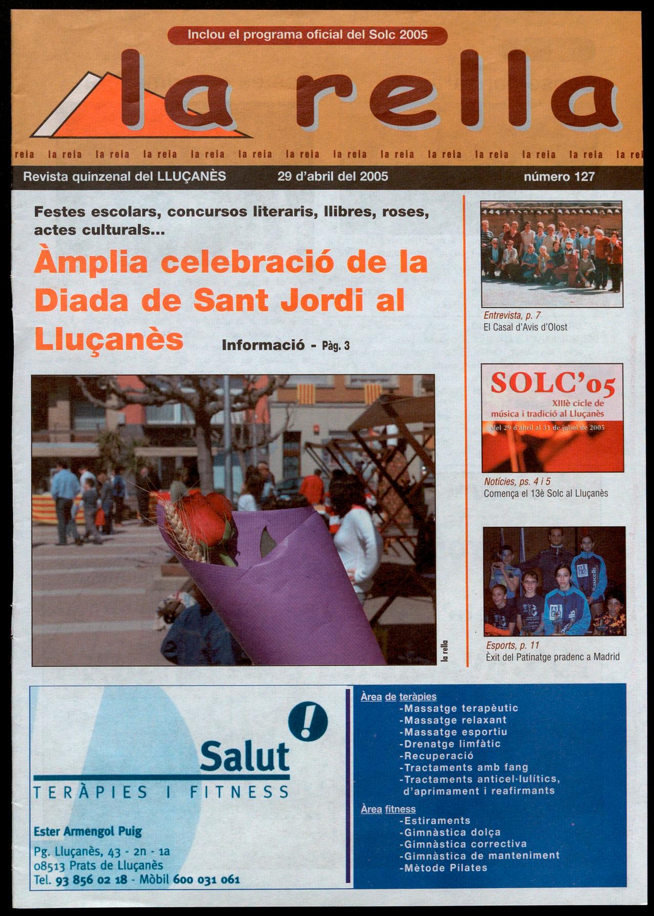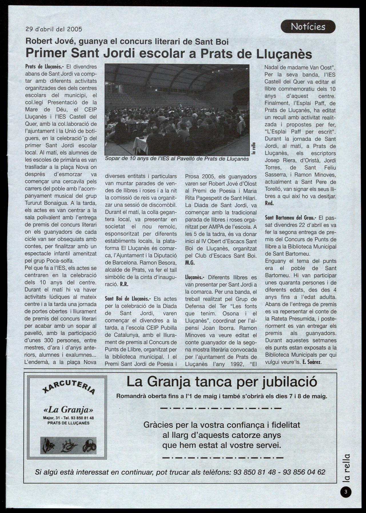 Prats de Llu�onès.- El divendres abans de Sant Jordi va comptar amb diferents activitats organitzades des dels centres escolars del municipi, el col.legi Presentació de la Mare de Déu, el CEIP Lluçanès l'lES Castell del Quer, amb la col.laboració de l'ajuntament i la Unió de botiguers, en la celebracióp del primer Sant Jordi escolar local. AI matí, els alumnes de les escoles de primària es van traslladar a la plaça Nova on després d'esmorzar va començar una cercavila pels carrers del poble amb l'acompanyament musical del grup Tururut Bonaigua. A la tarda, els actes es van centrar a la sala polivalent amb l'entrega de premis del concurs literari on els guanyadors de cada cicle van ser obsequiats amb contes, per finalitzar amb un espectacle infantil amenitzat pel grup Poca-solfa. Pel que fa a l'lES, els actes se centraren en la celebració dels 10 anys del centre. Durant el matí hi va haver activitats lúdiques al mateix centre a la tarda una jornada de portes obertes lliurament de premis del concurs literari per acabar amb un sopar al pavelló, amb la participació d'unes 300 persones, entre mestres, d'ara d'anys anteriors, alumnes exalumnes L'endemà, a la plaça Nova
