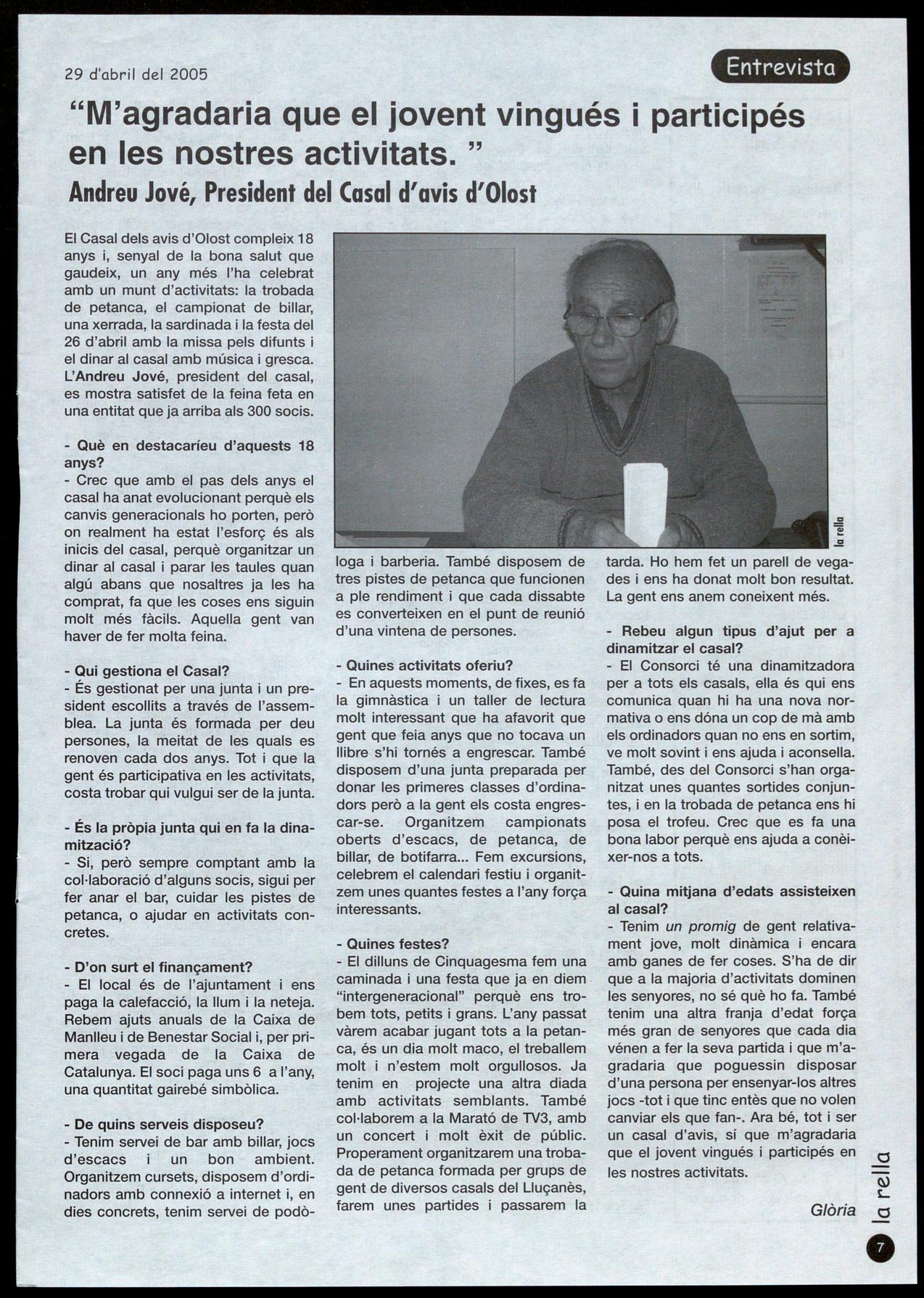 El Casal dels avis d'Olost compleix 18 anys i, senyal de la bona salut que gaudeix, un any més l'ha celebrat amb un munt d'açtivitats: la trobada de petanca, el campionat de billar, una xerrada, la sardinada la festa del 26 d'abril amb la missa pels difunts i el dinar al casal amb música i gresca. L'Andreu Jové, president del casal, es mostra satisfet de la feina feta en una entitat que ja arriba als 300 socis.